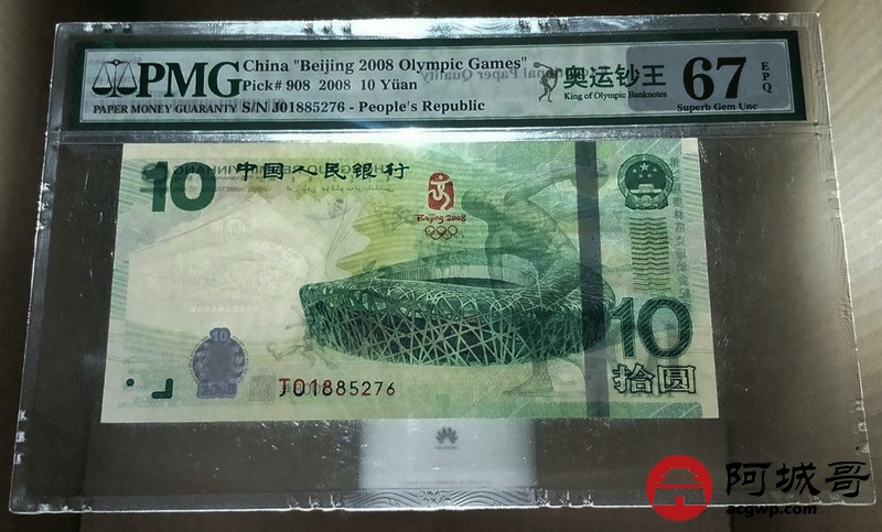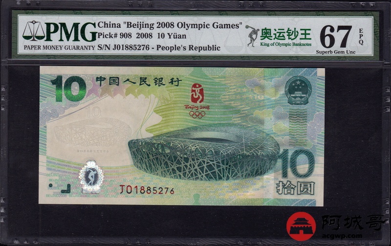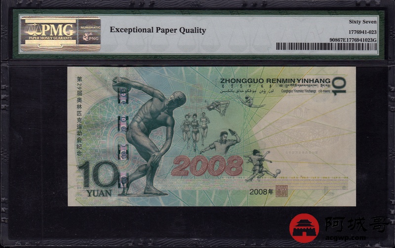 Lot:18 2008年 中国人民银行 拾圆 奥运绿钞 PMG 67 EPQ 好号无4尾号6