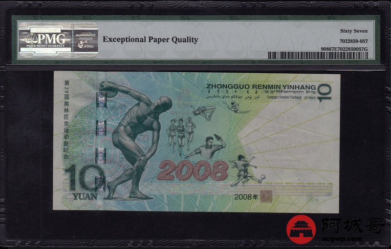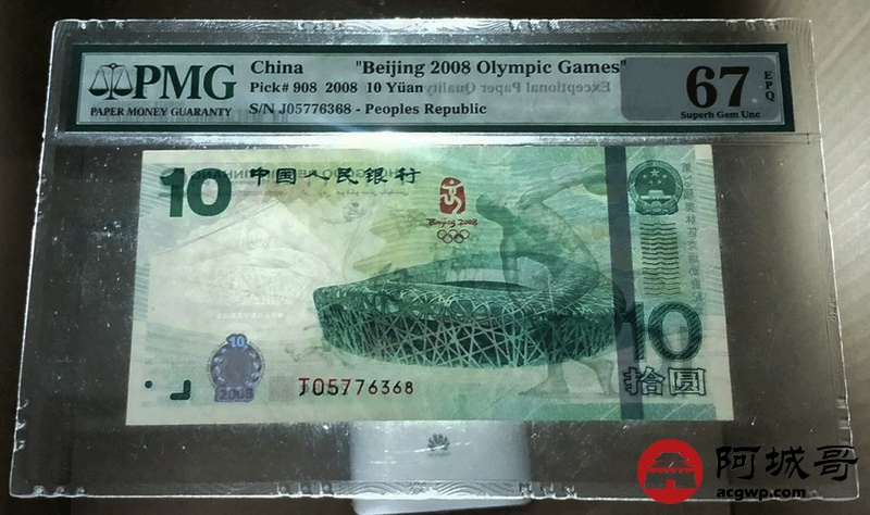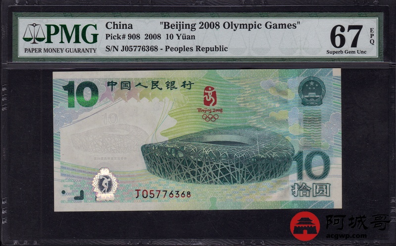 Lot:27 2008年 拾圆 奥运绿钞 PMG 67 EPQ 好号无4 尾号68