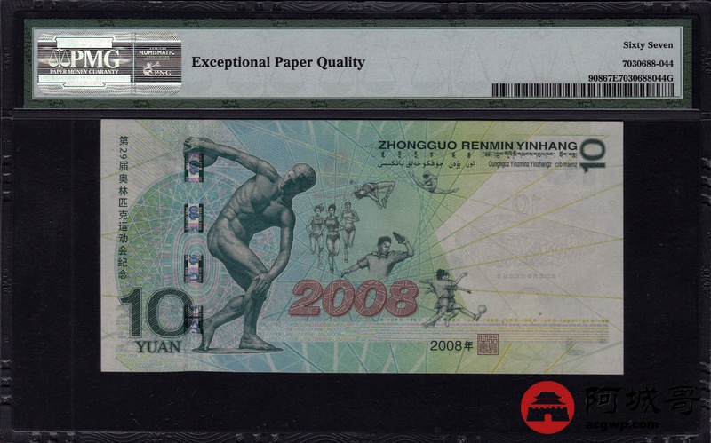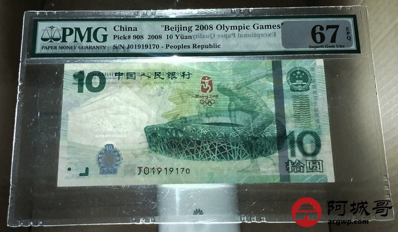 Lot:25 2008年 10元 奥运绿钞 中国人民银行 PMG 67 EPQ 好号无4