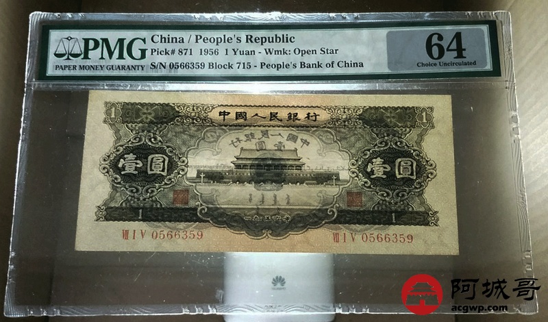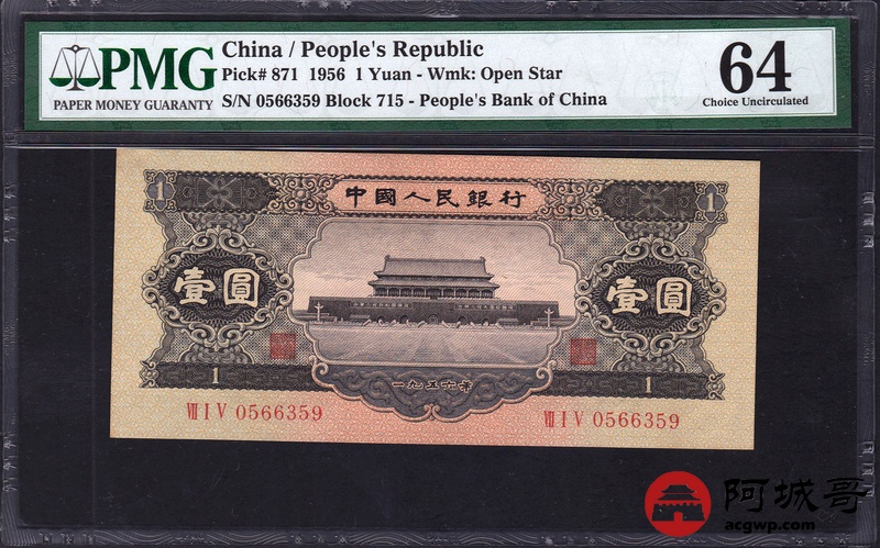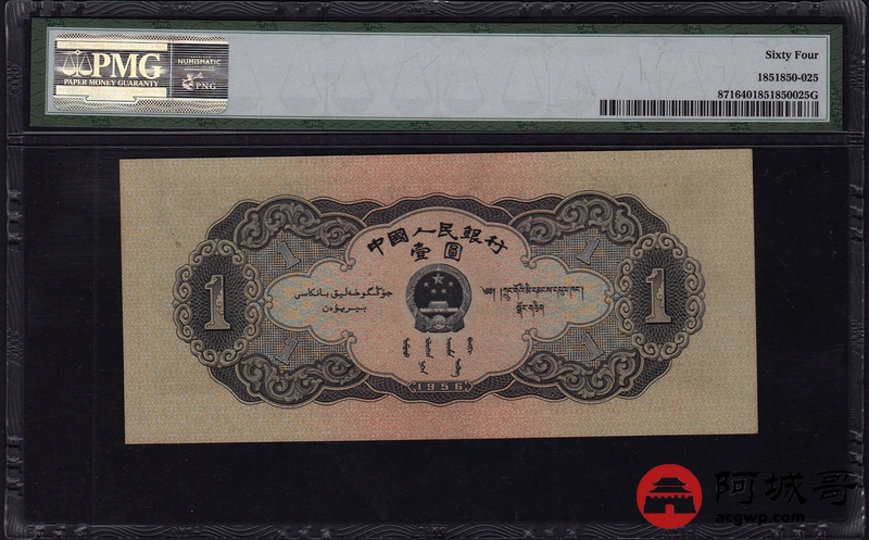 Lot:23 二版人民币 1956年 黑壹圆 中国人民银行 PMG 64 好号无47