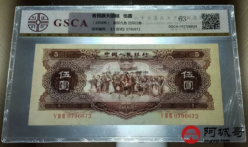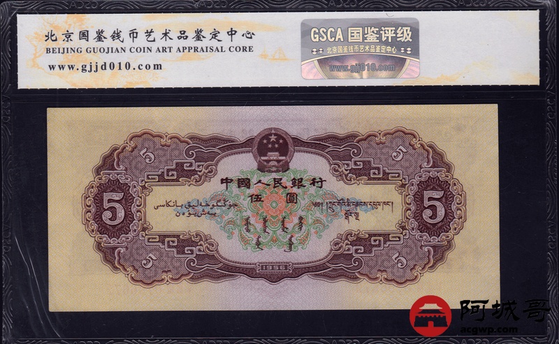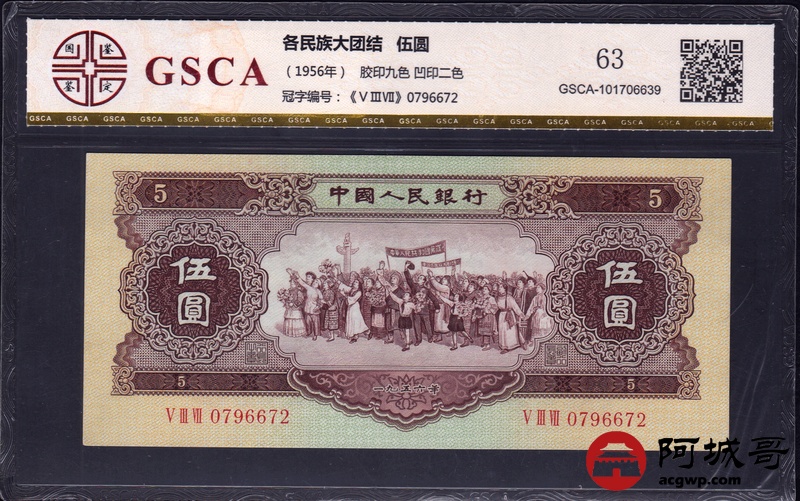 Lot:32 二版人民币 1956年 黄伍圆 中国人民银行 GSCA 63 好号无4