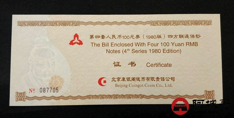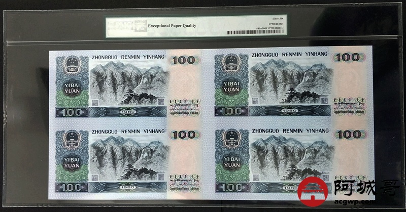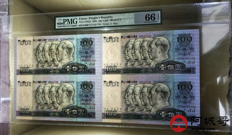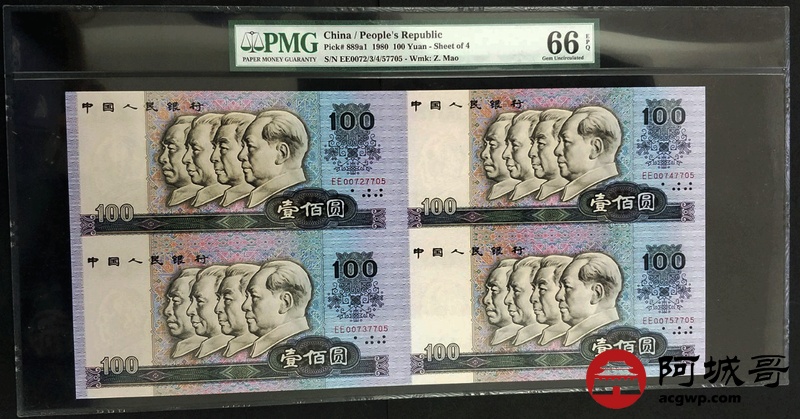 Lot:24 1980年 壹佰圆 中国人民银行 连体钞 PMG 66 EPQ 好号无4 带册带证书