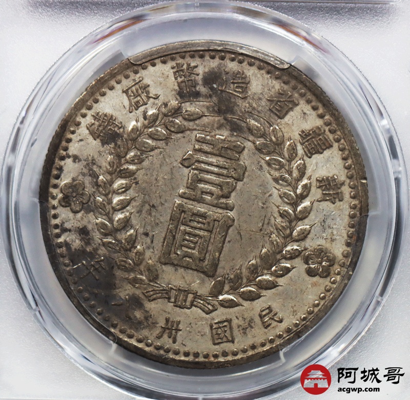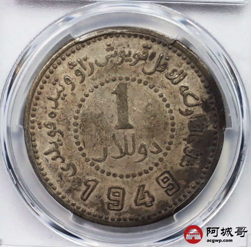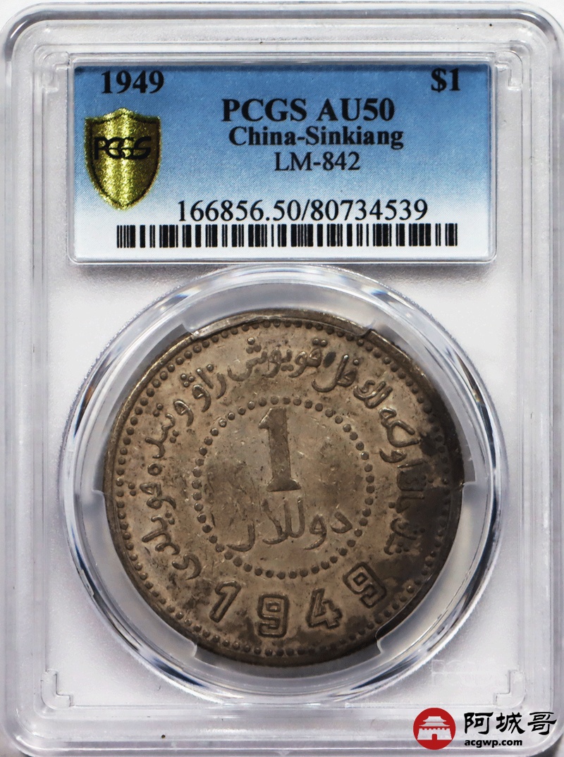 Lot:29 民国三十八年新疆1949 壹圆 连笔壹小背逆PCGS AU50
