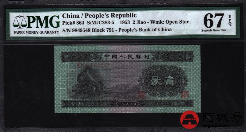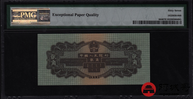 Lot:23 二版人民币 1953年 贰角火车头 PMG 67EPQ 尾号8