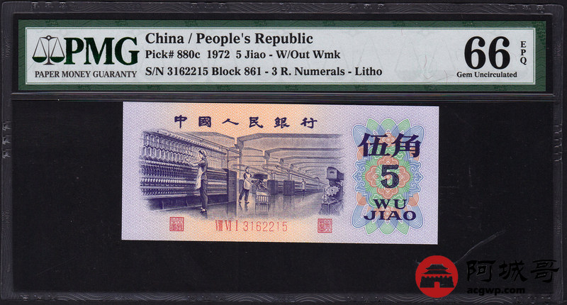 Lot:1 三版人民币 1972年 伍角 平版 无水印 中国人民银行 PMG 66 EPQ 好号无47
