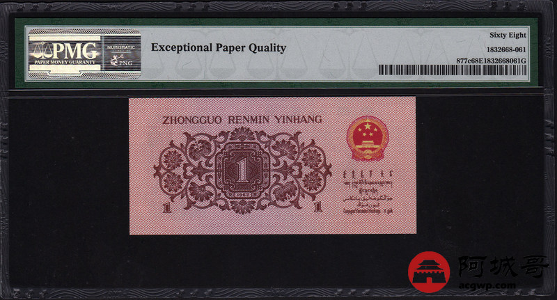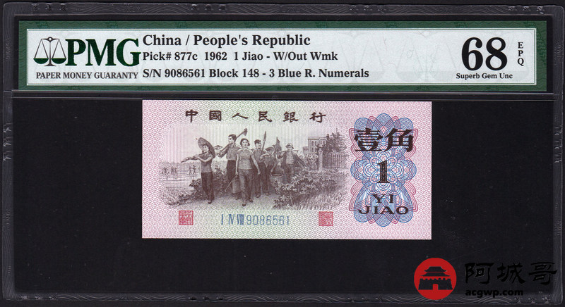 Lot:5 三版人民币 1962年 壹角 蓝3冠 平版 好号全程无47 高分 PMG 68EPQ