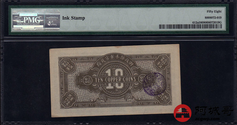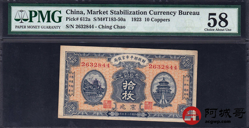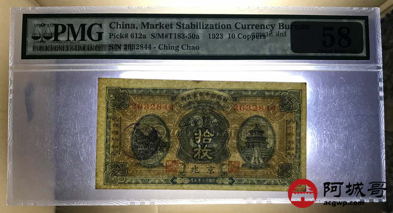 Lot:28 财政部平市官钱局 民国12年 拾枚 京兆地名 PMG 58