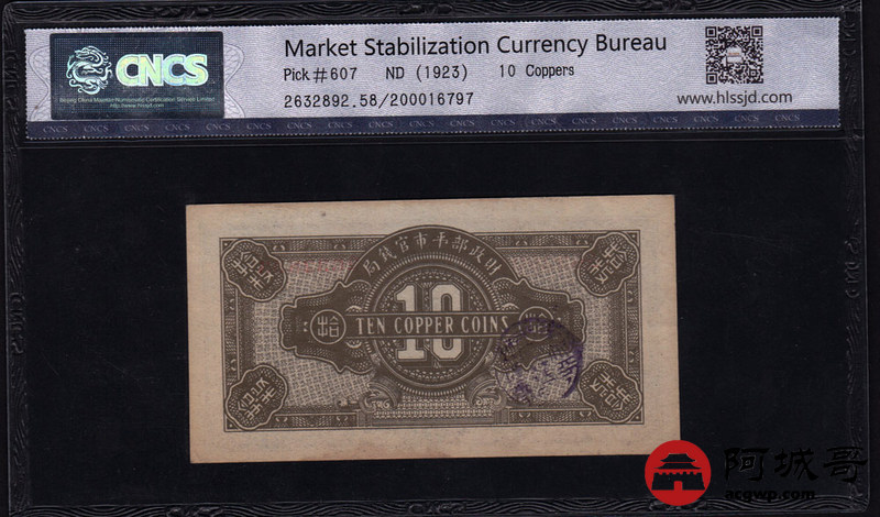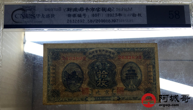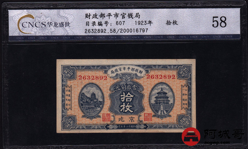 Lot:19 财政部平市官钱局 拾枚 京兆地名 民国12年 好号全程无47 CNCS 58