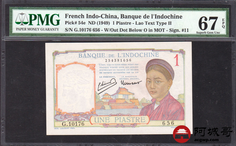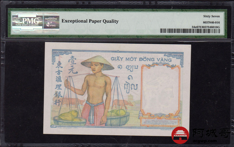 Lot:4 东方汇理银行 壹圆 法属印度支那 原票全新 票面凸凹感强 顶级品相 PMG 67EPQ