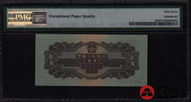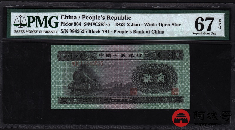 Lot:30 二版人民币 1953年 贰角火车头 PMG 67EPQ