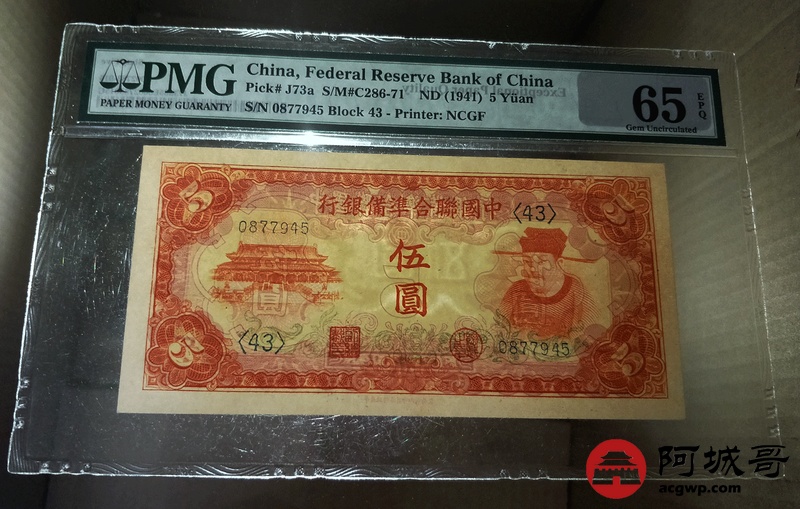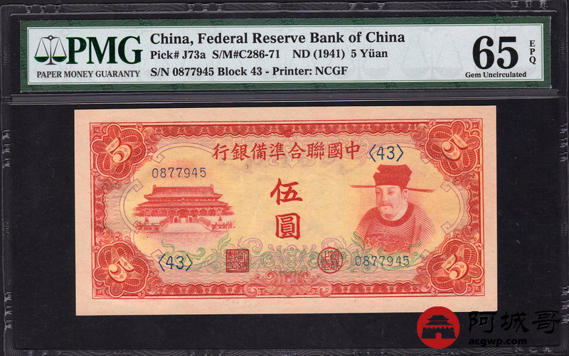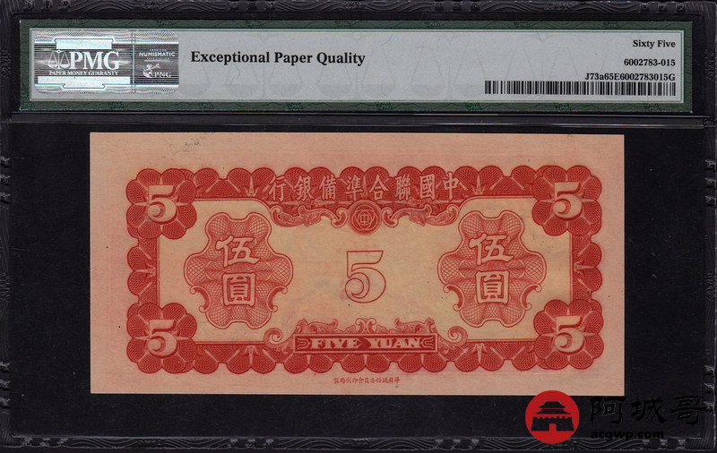 Lot:21 中国联合准备银行 伍圆 PMG 65EPQ 色泽艳丽 原票状态好 PMG 65EPQ