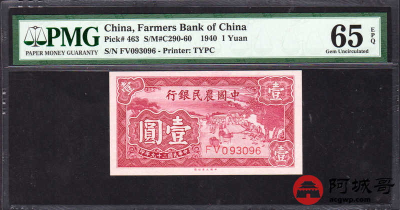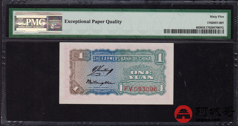 Lot:26 1940年 中国农民银行 壹圆 PMG 65EPQ