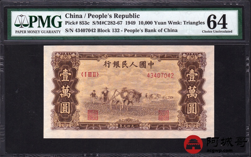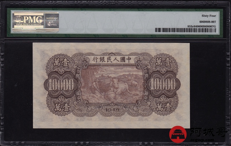 Lot:12 一版人民币 1949年 壹萬圆双马耕地 菱花水印 中国人民银行 PMG 64
