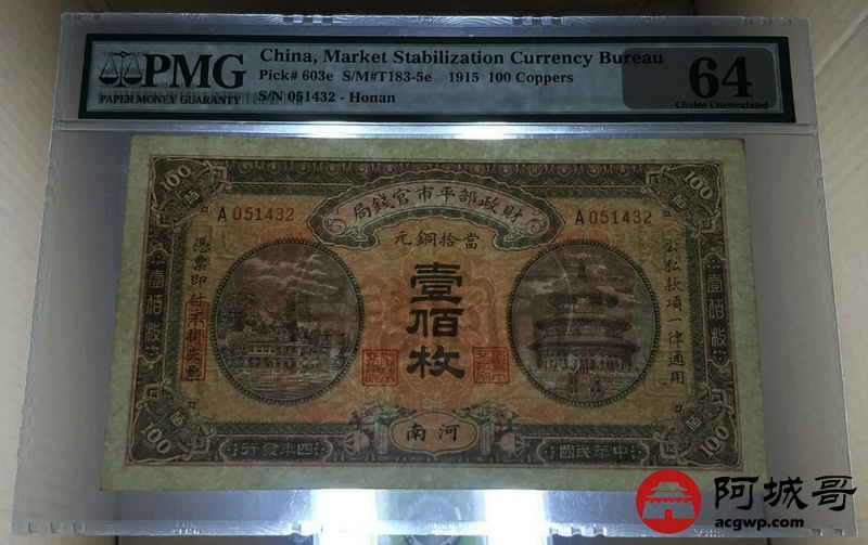 Lot:16 民国四年 壹佰枚 财政部平市官钱局 PMG 64