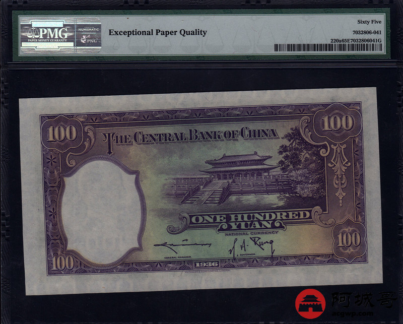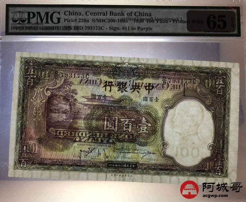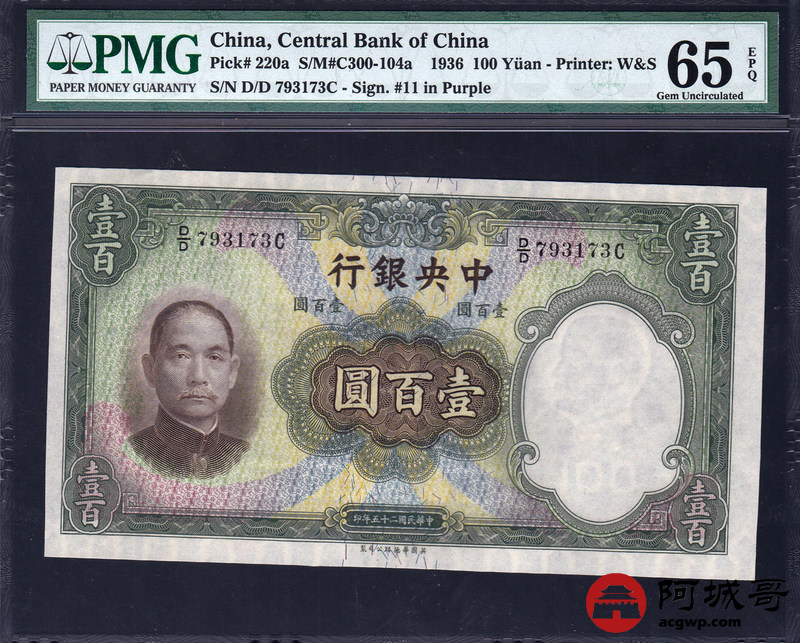 Lot:31 中央银行 民国25年 壹佰圆 华德路版版 设计精美大方 好号全程无4 PMG 65EPQ