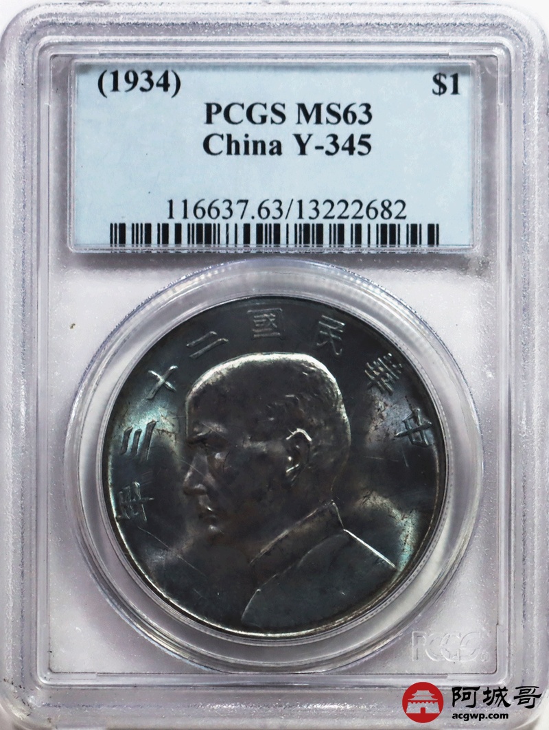 Lot:10 a民国二十三年船洋 紫罗兰包浆 PCGS MS63