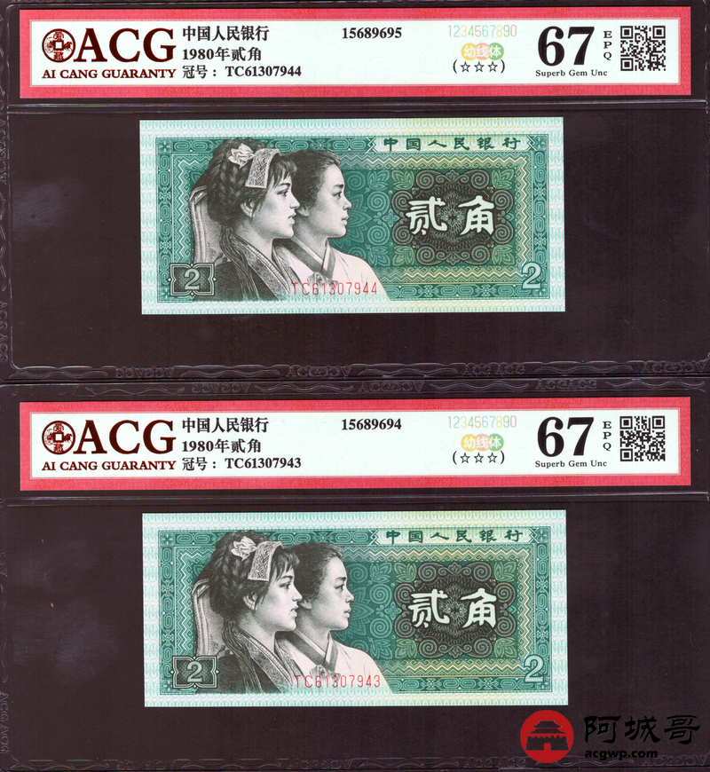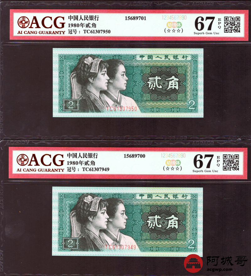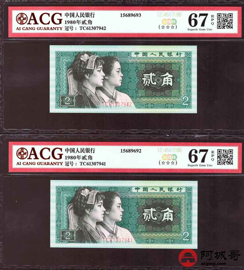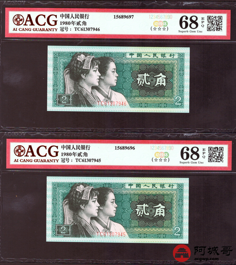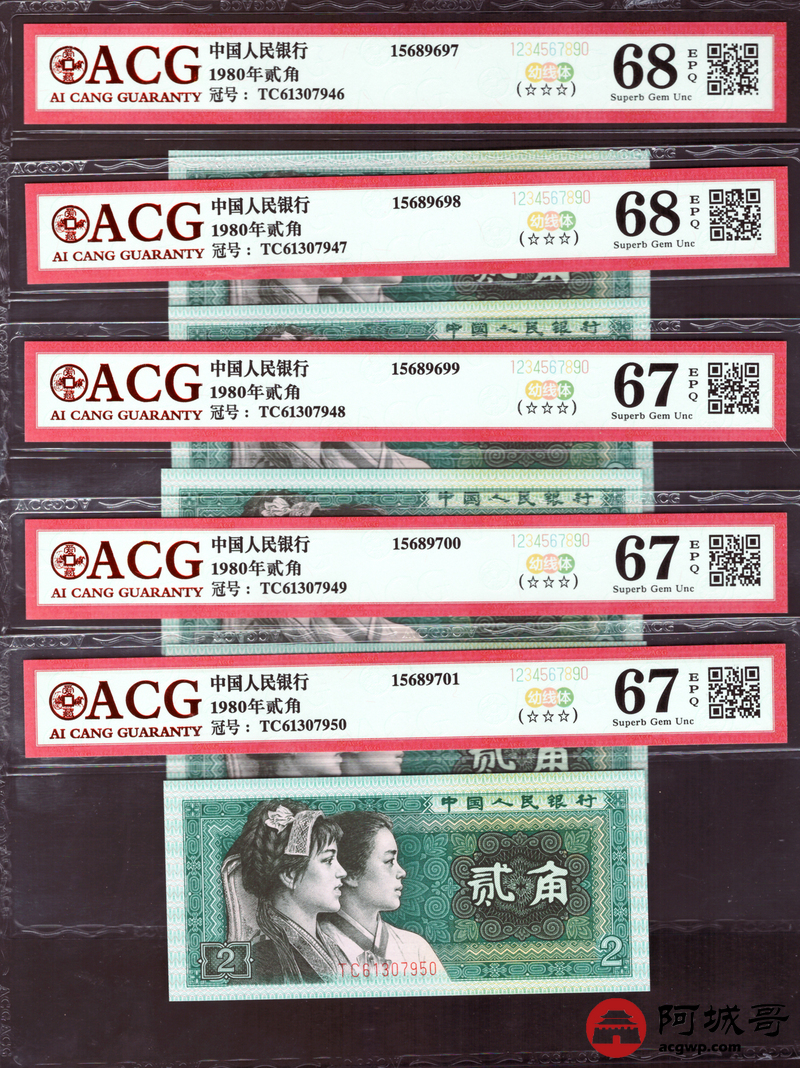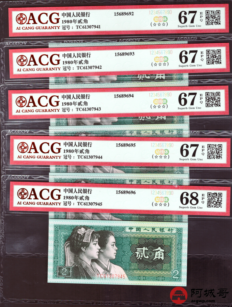 Lot:40 四版 1980年 贰角 ACG 68、67EPQ 幼线体 十枚连号一组