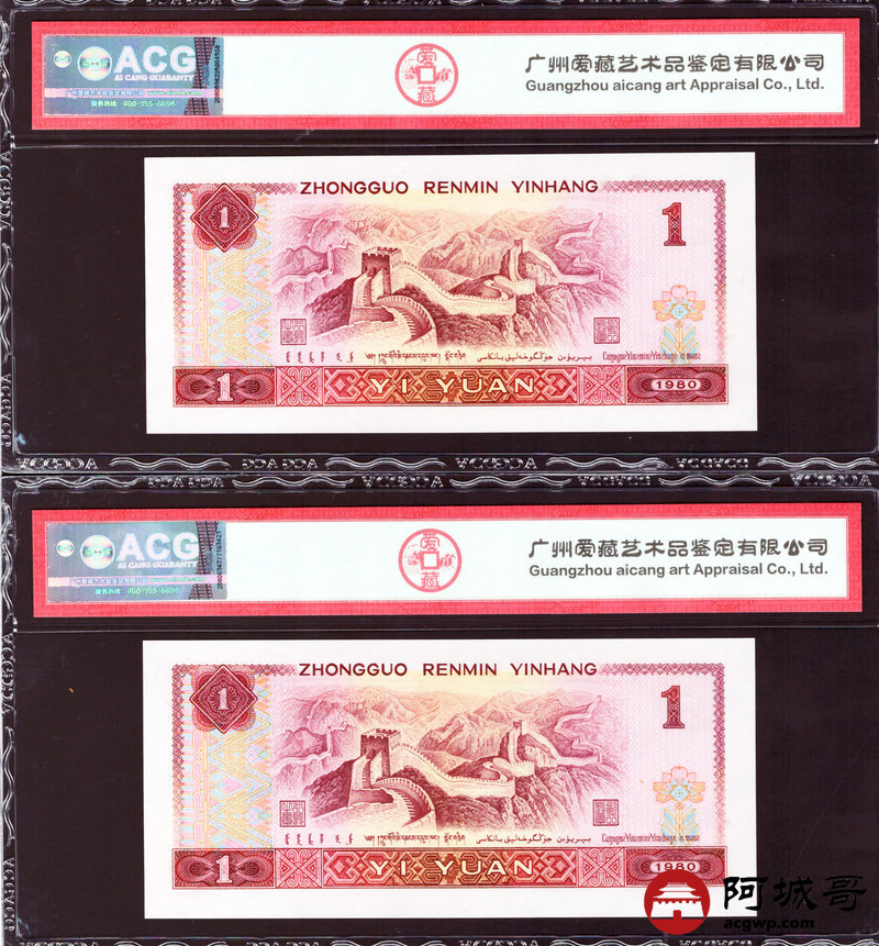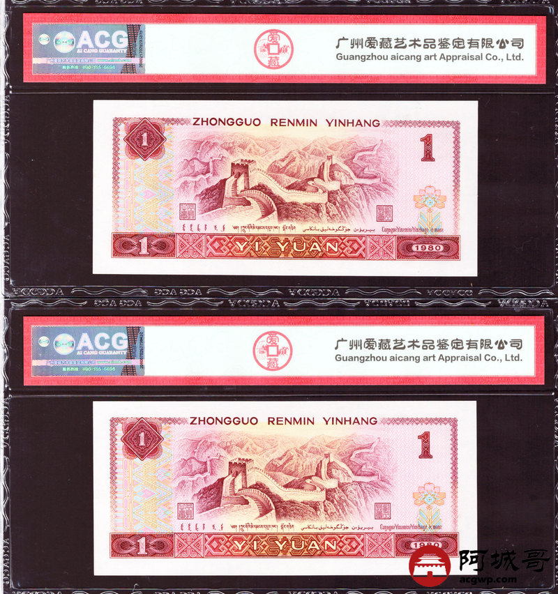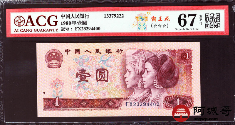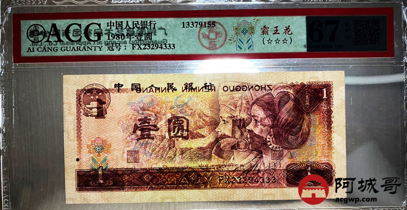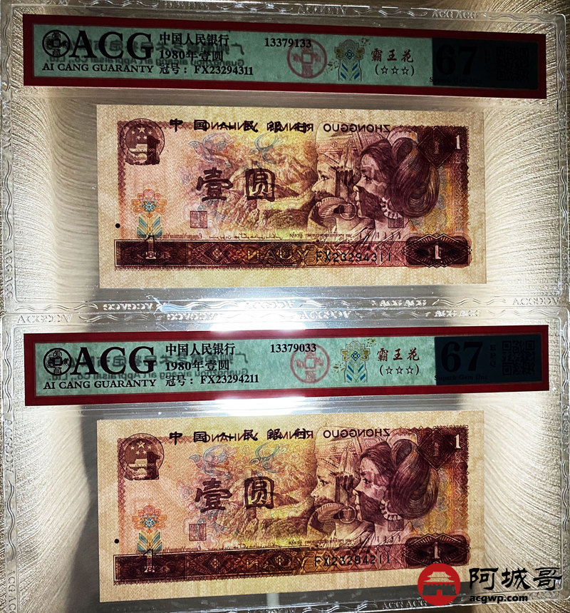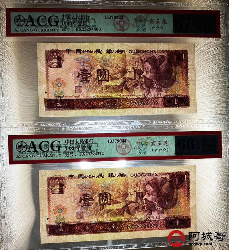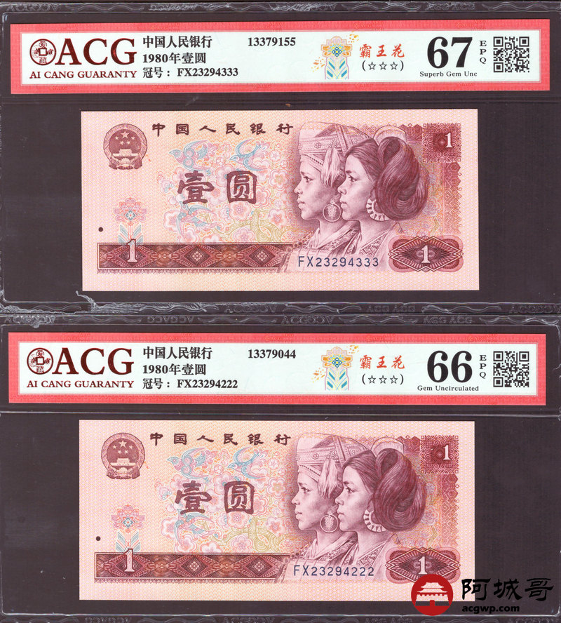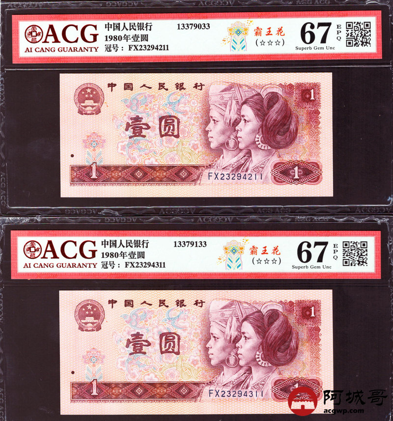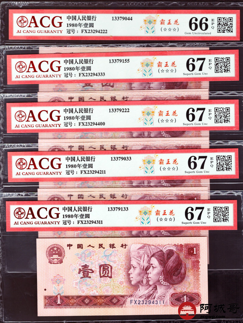 Lot:27 四版 1980年 壹圆 霸王花 5张 内有两张豹子号 ACG 67EPQ、ACG 66EPQ