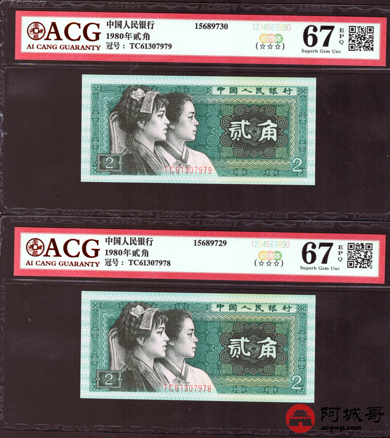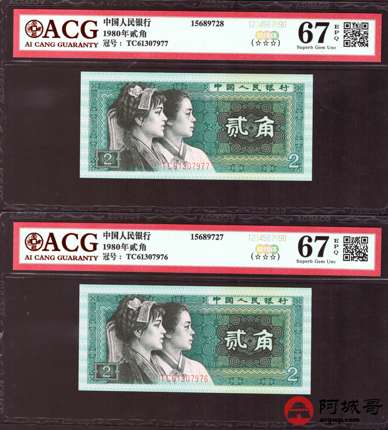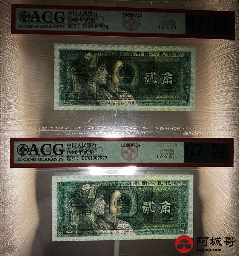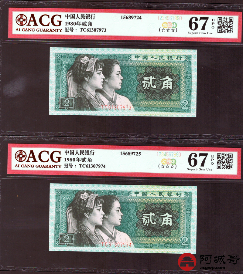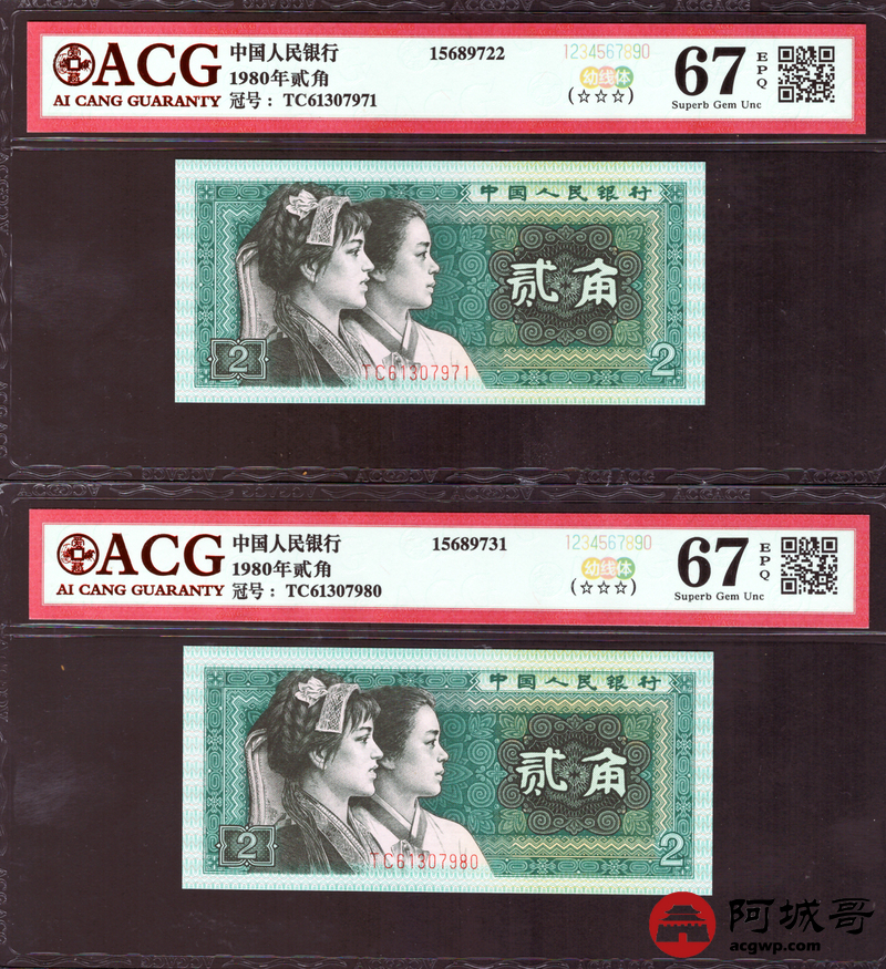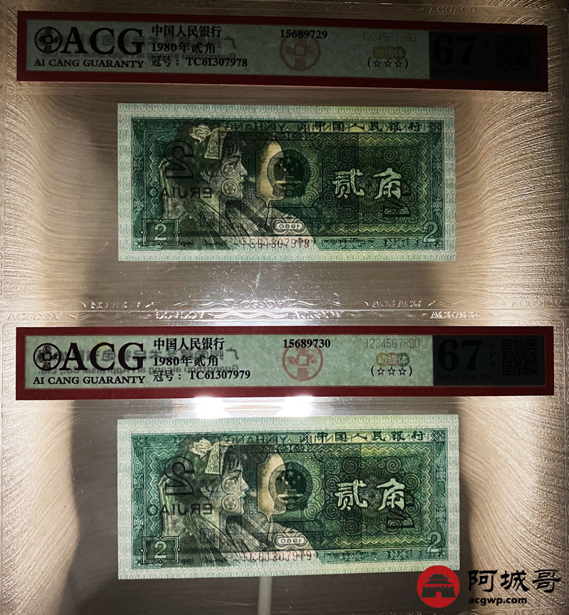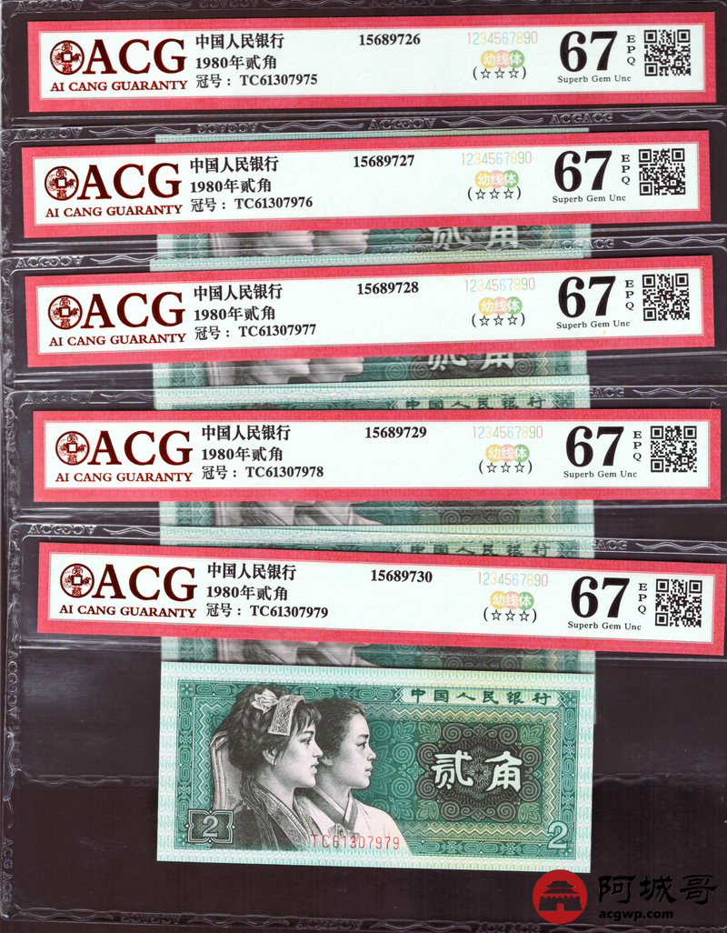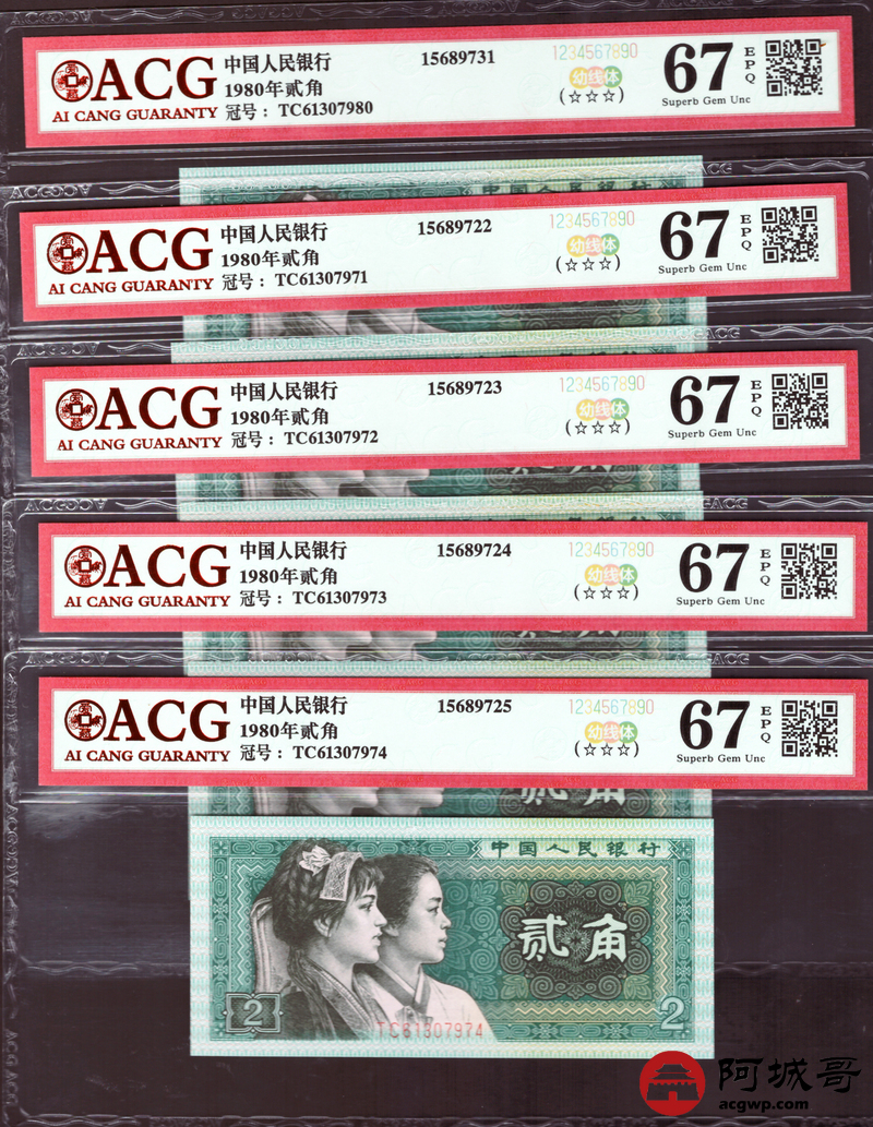 Lot:35 四版 1980年 贰角 ACG 67EPQ 幼线体 十枚连号一组 好号无4