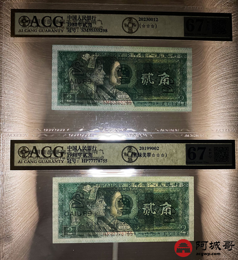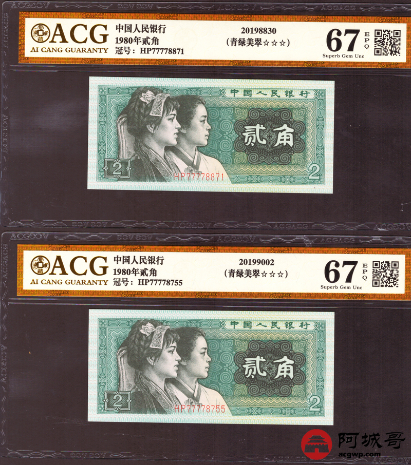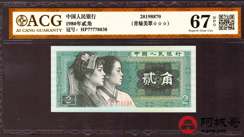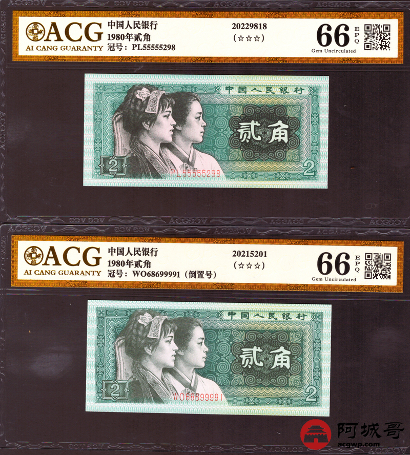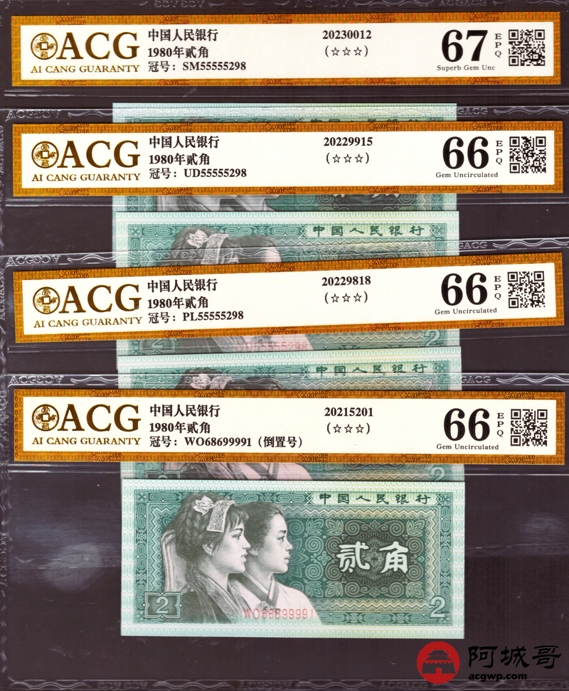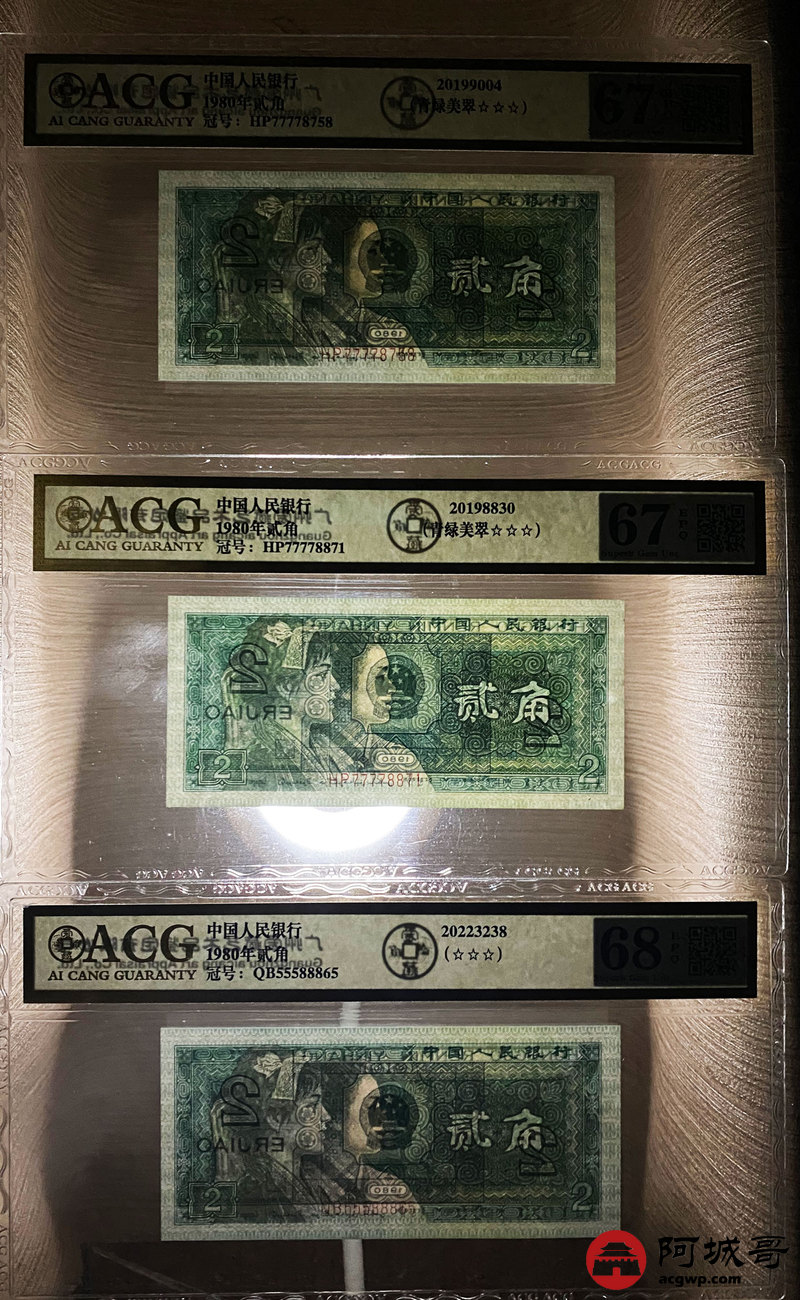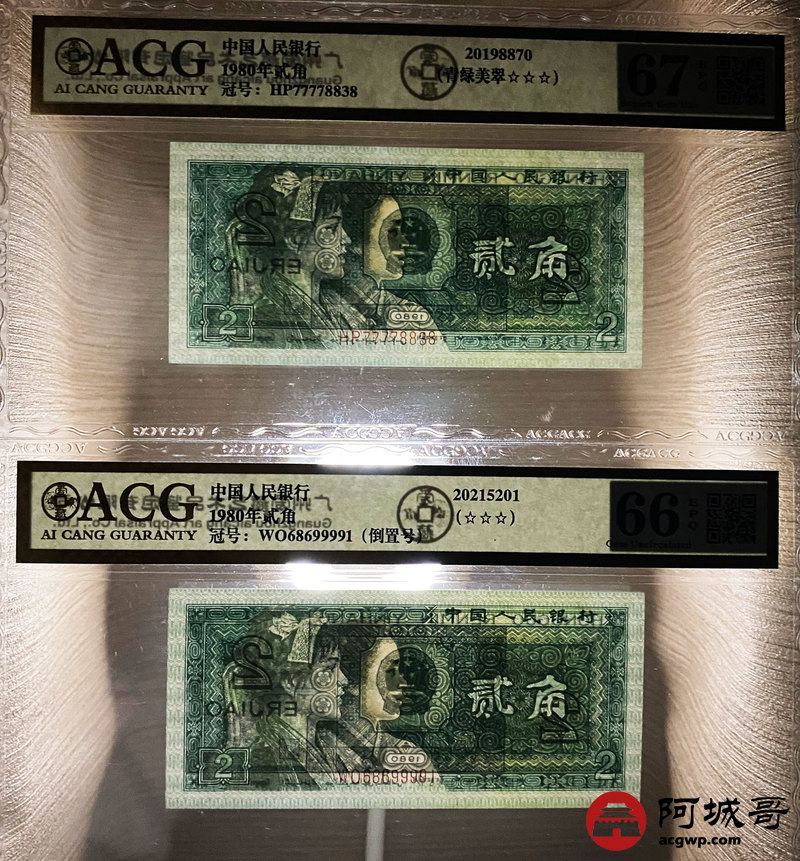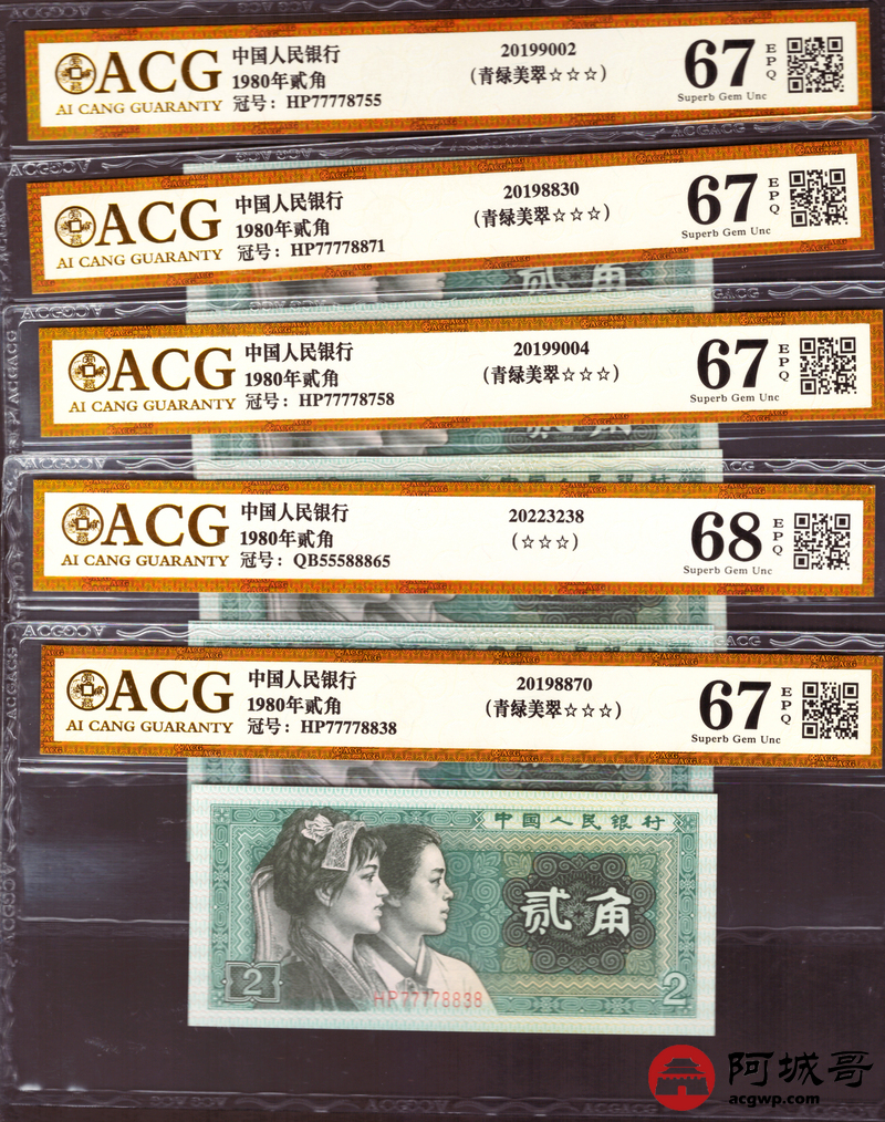 Lot:39 四版 1980年 贰角 ACG 66EPQ、 67EPQ 、68EPQ 九枚一组 内有青绿美翠、倒置号