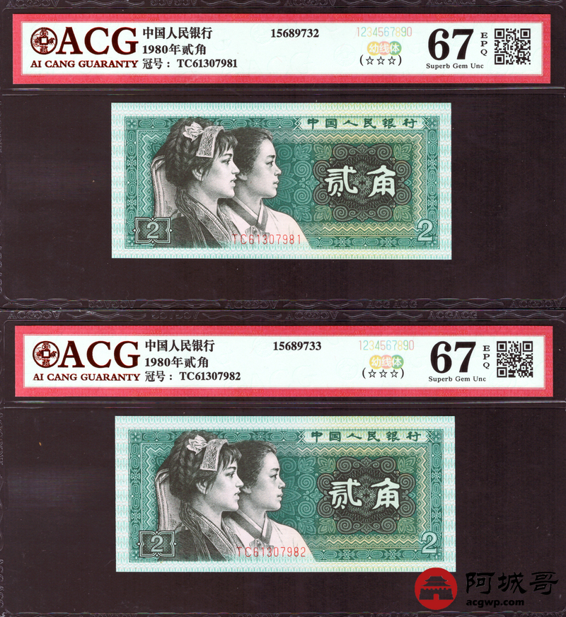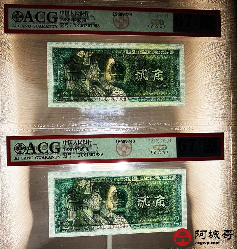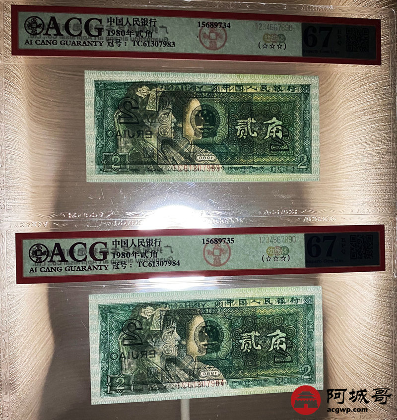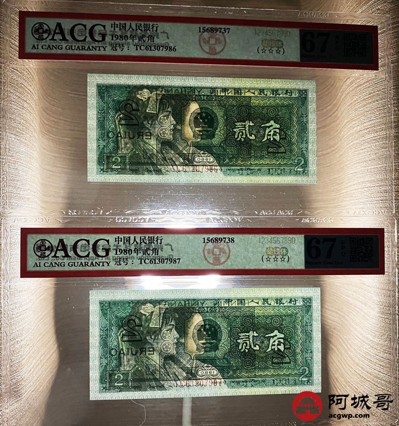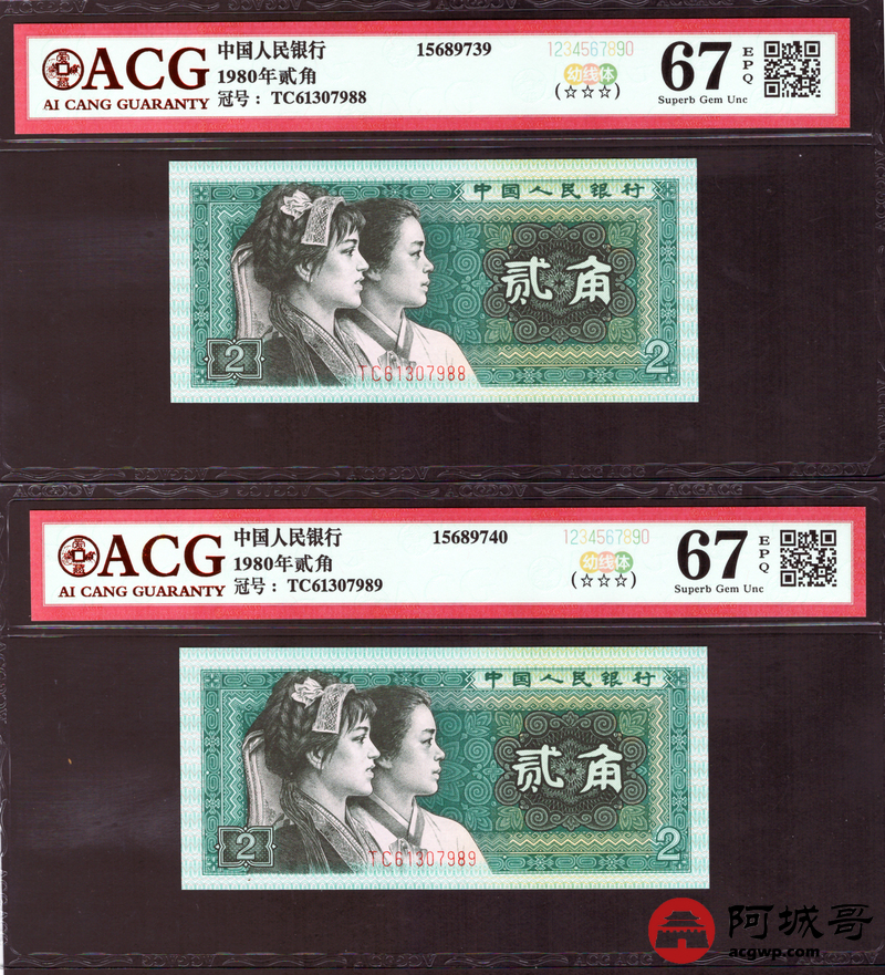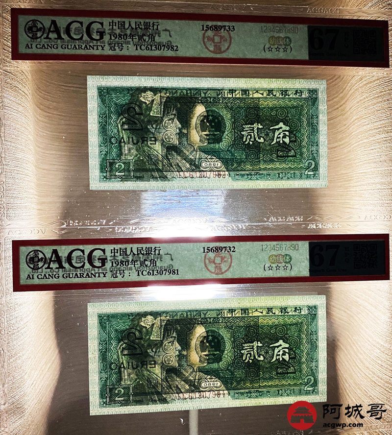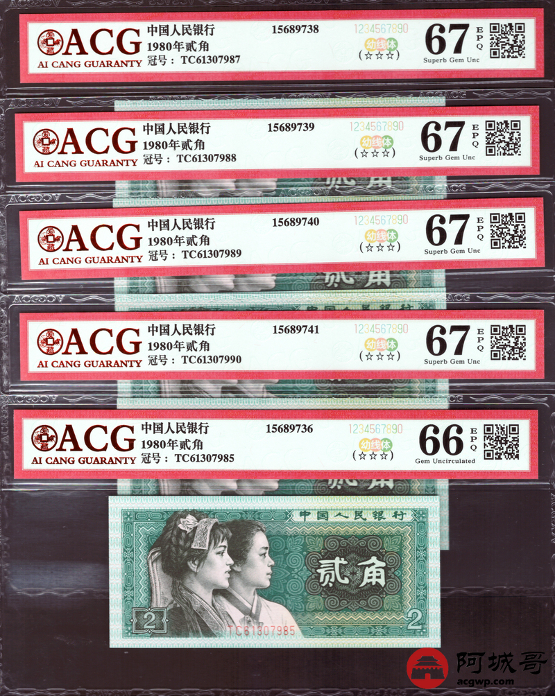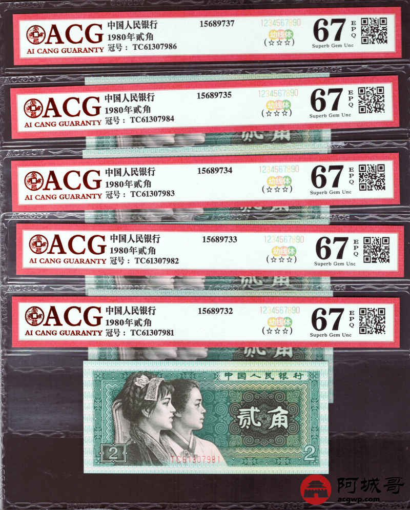 Lot:24 四版 1980年 贰角 幼线体 ACG 67EPQ 好号无47 十枚连号一组