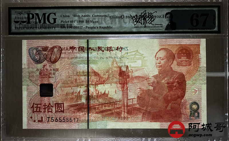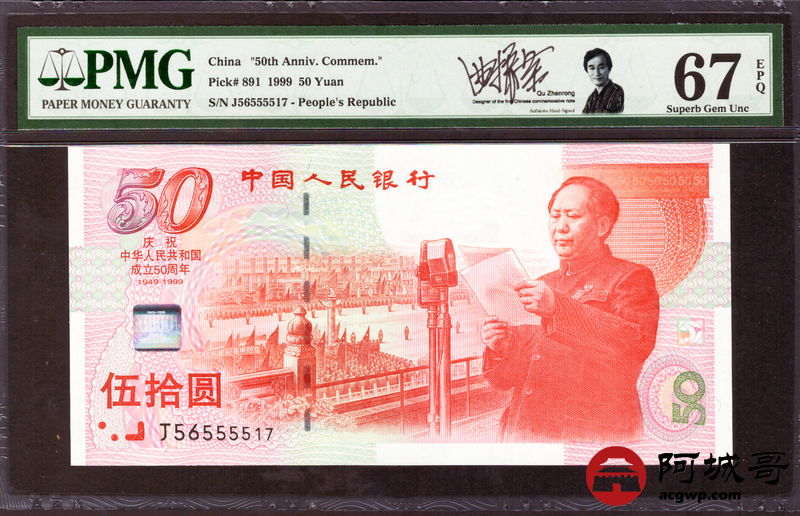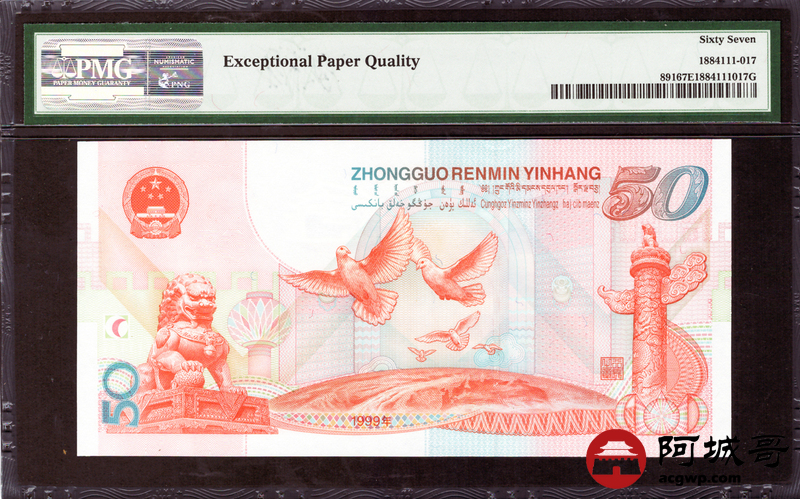 Lot:3 1999年 建国钞 伍拾圆 PMG 67EPQ 好号无4 PMG带设计者签名标 内有狮子号