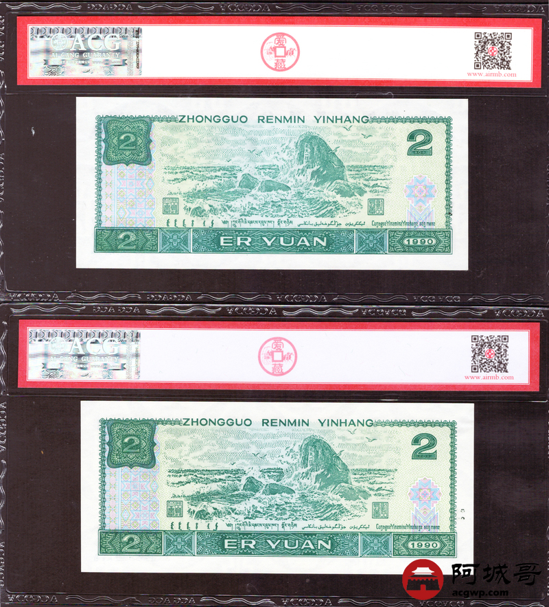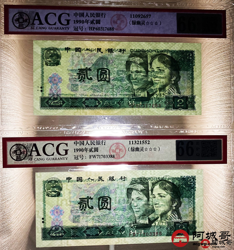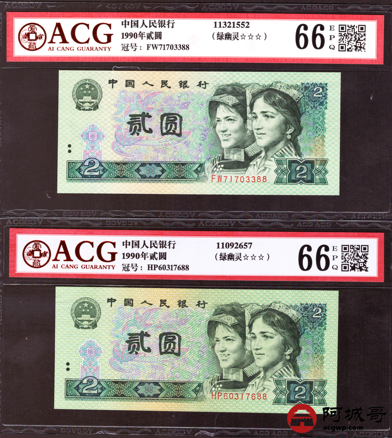 Lot:30 四版 1990年 绿幽灵贰圆 两枚一组 ACG 66EPQ 双尾号88 好号无4