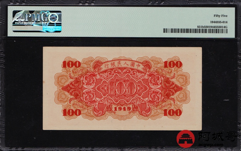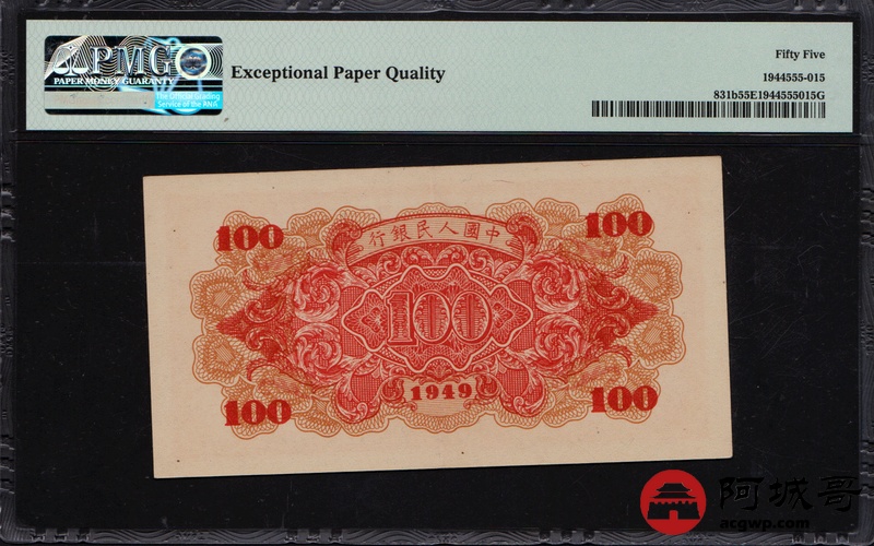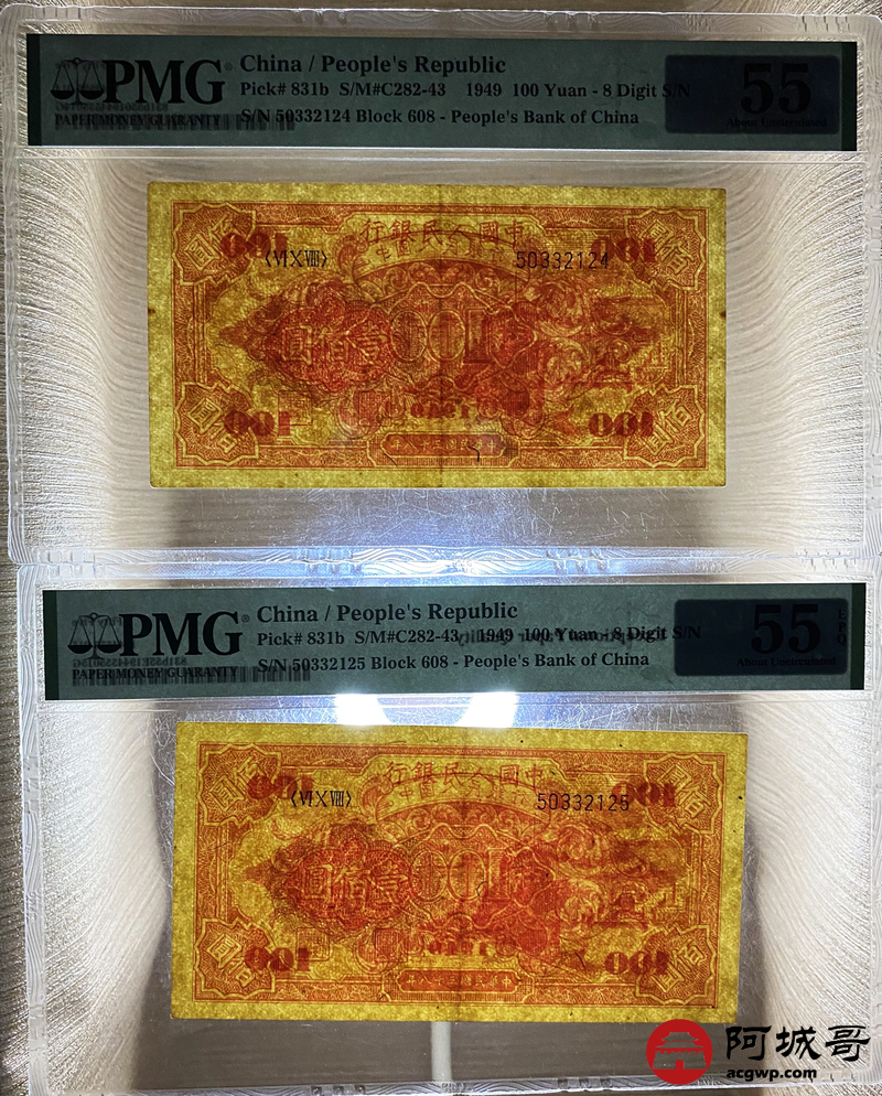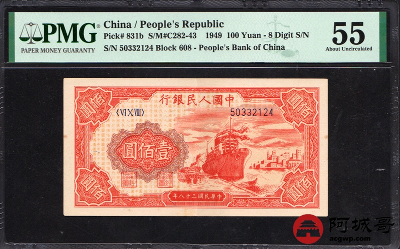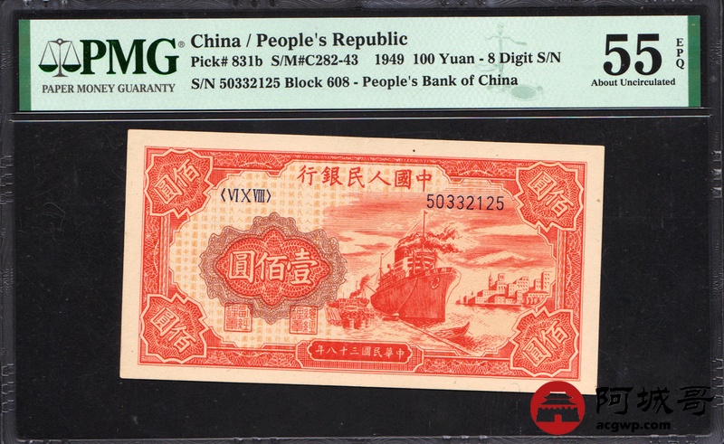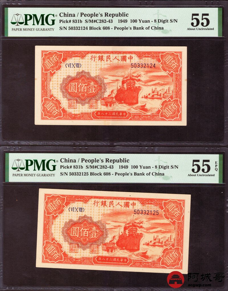 Lot:16 一版 民国38年 壹佰圆 红帆船 PMG 55 /PMG 55 EPQ 二连号