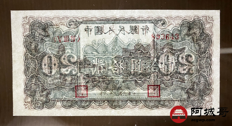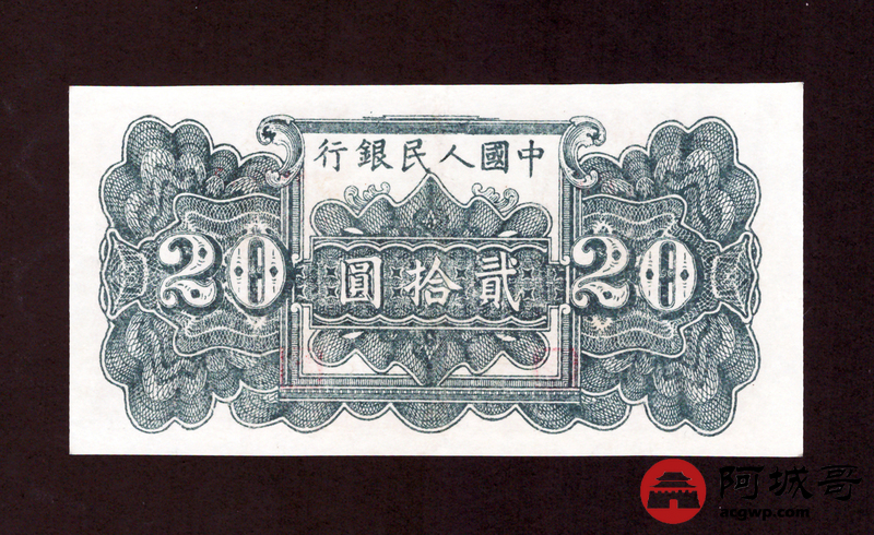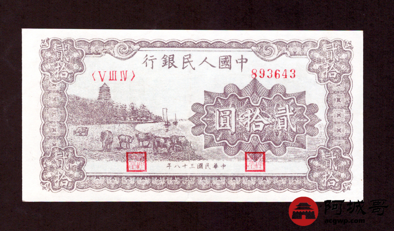 Lot:20 一版 民国38年 贰拾圆紫色六和塔 微有修补 78成新