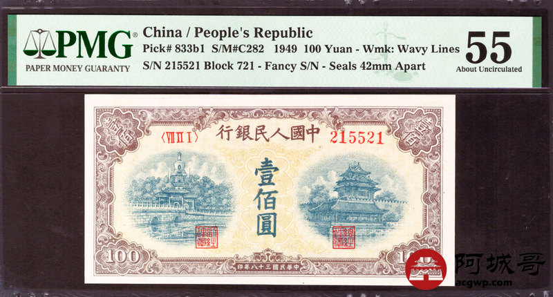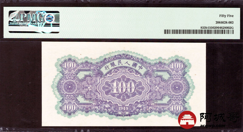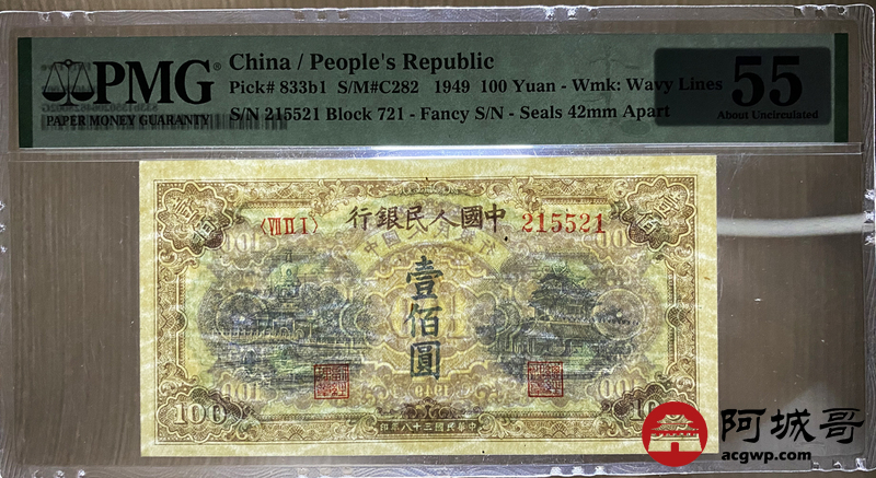 Lot:12 一版 民国38年 贰佰圆黄北海 翘脚2、人三、印章宽距 稀少 PMG 55 好号无47