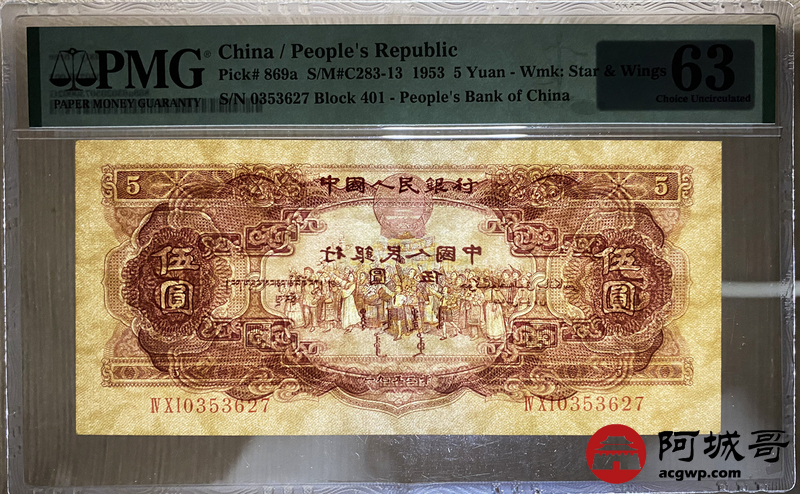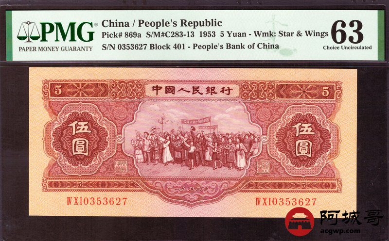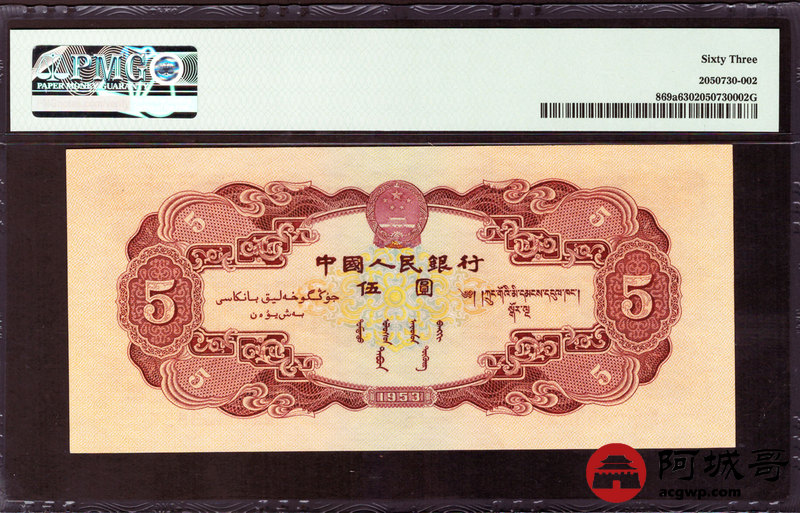 Lot:15 二版 1953年 红伍圆 较少见 好号无4 PMG 63 原票 尺寸足