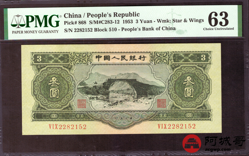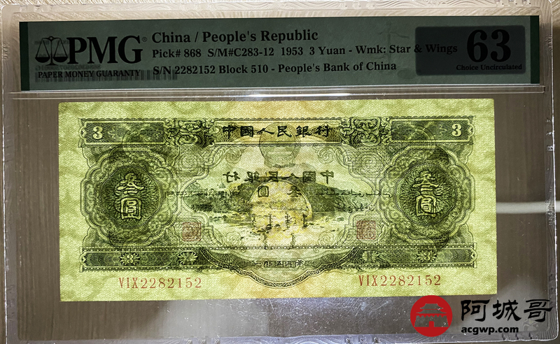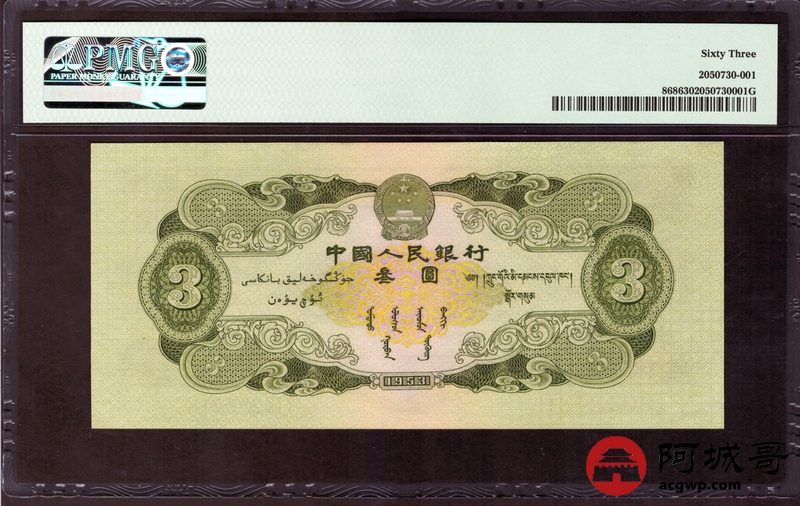 Lot:14 二班 1953年 叁圆 PMG 63 好号无47 原票 尺寸足 二版人民币 1953年 绿叁圆 龙源井冈山叁圆 俗称“苏叁圆” 是人民币史上唯一一枚叁圆面额票券 由周总理指定 由苏联代印 珍稀品种