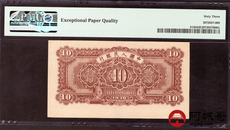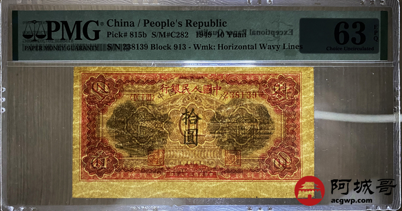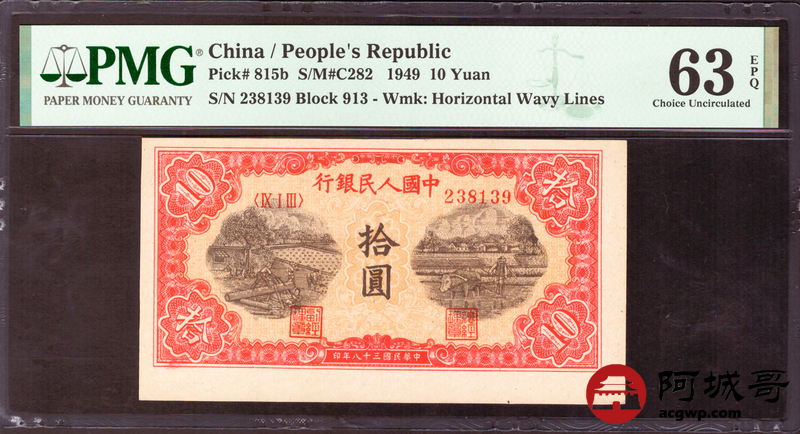 Lot:17 一版 民国38年 拾圆锯木 好号无47 PMG 63EPQ