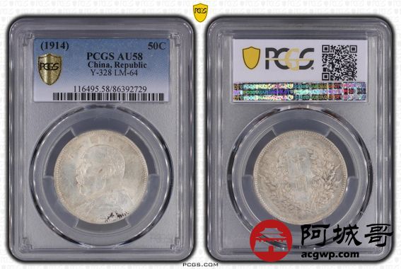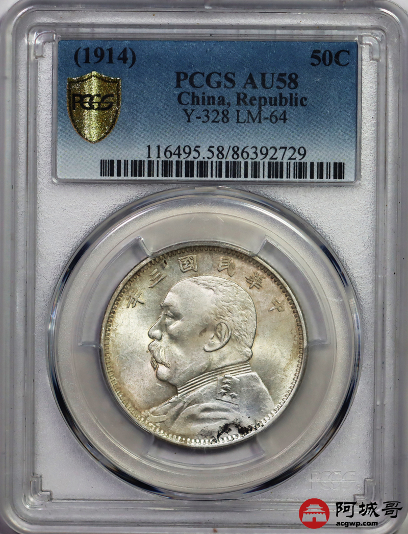 Lot:1 原光 淡彩转光 民国三年大头 中元 PCGS AU 58