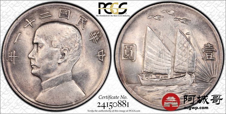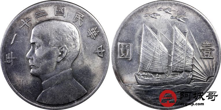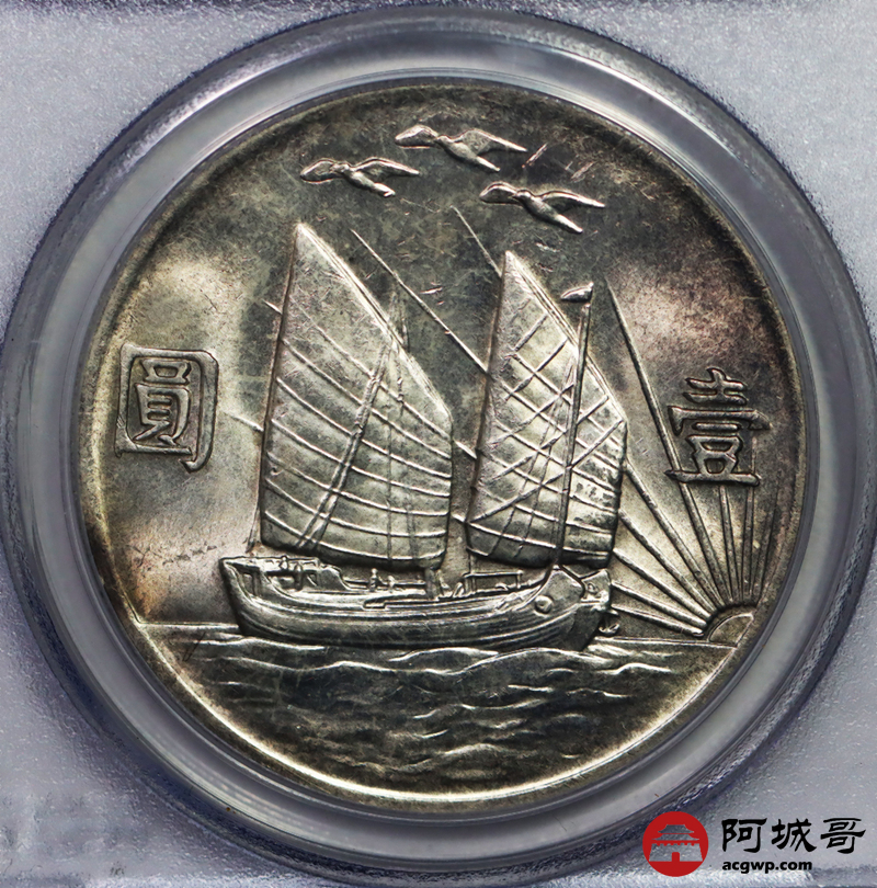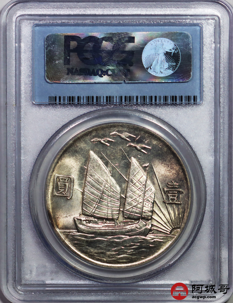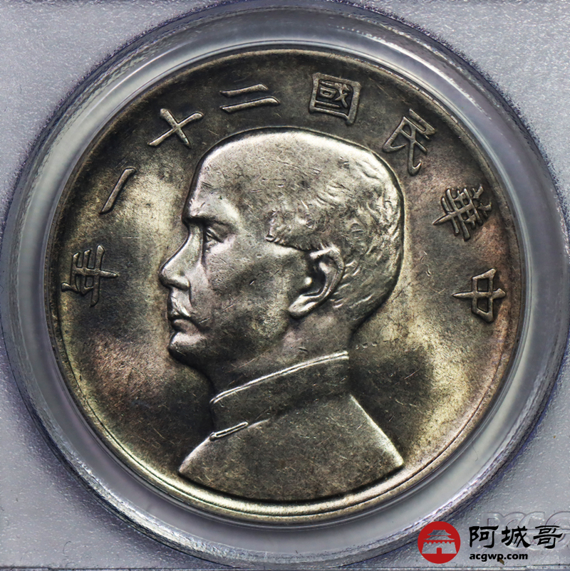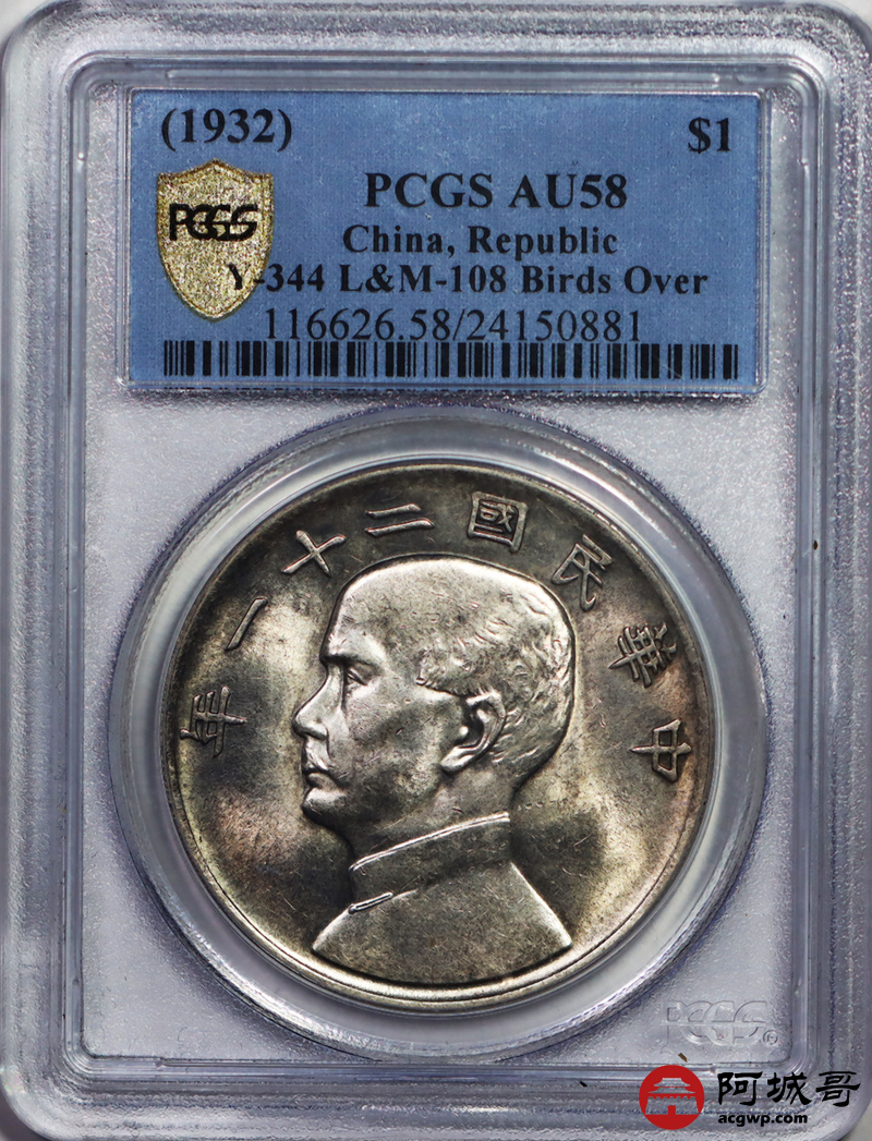 Lot:13 黄油转光 民国二十一年孙像三鸟壹圆 PCGS AU58