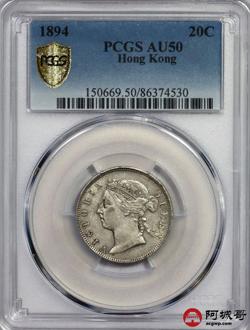Lot:15 原味老味道1894年少见年份香港贰豪 PCGS AU50