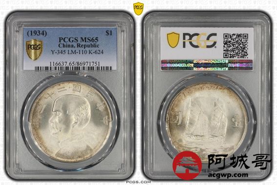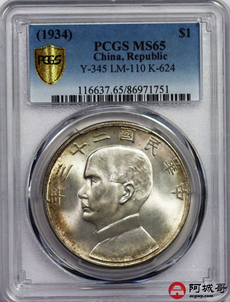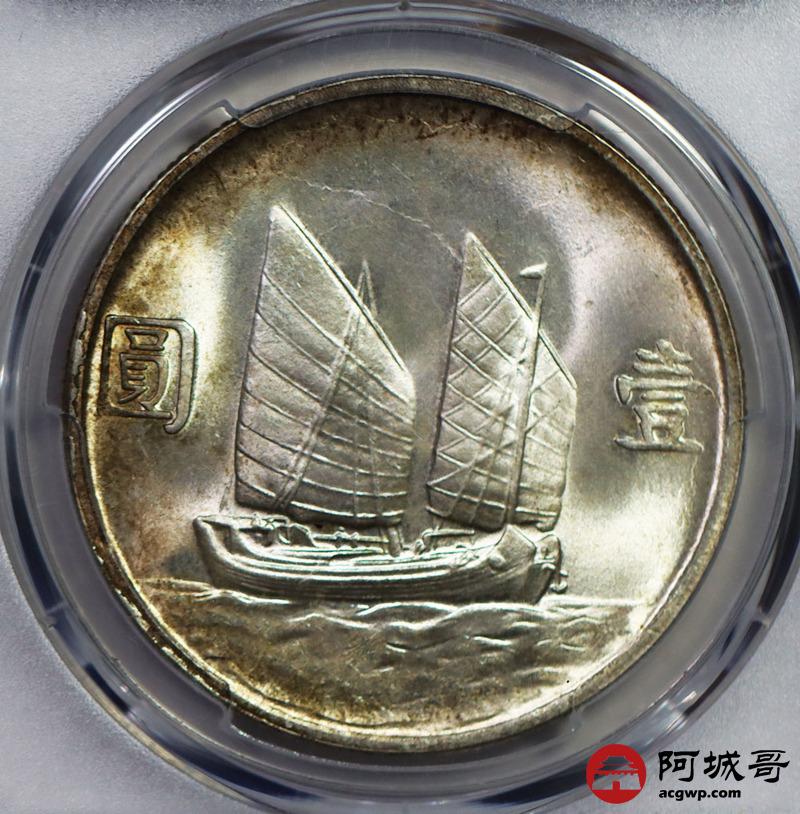 Lot:2 原光 白纸 底板 民国23年船洋 壹元 PCGS MS 65