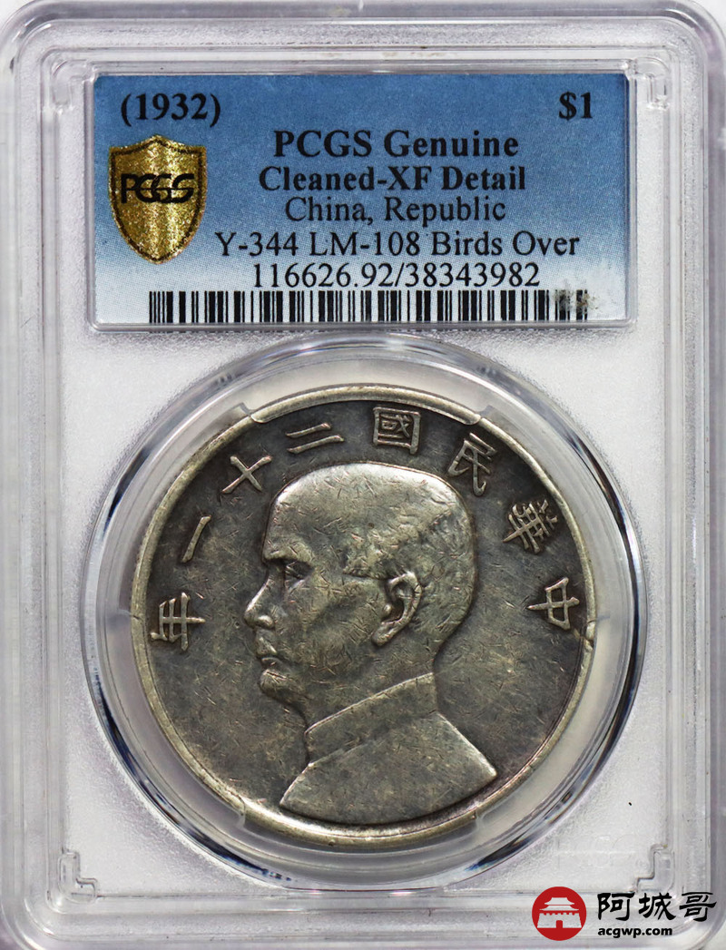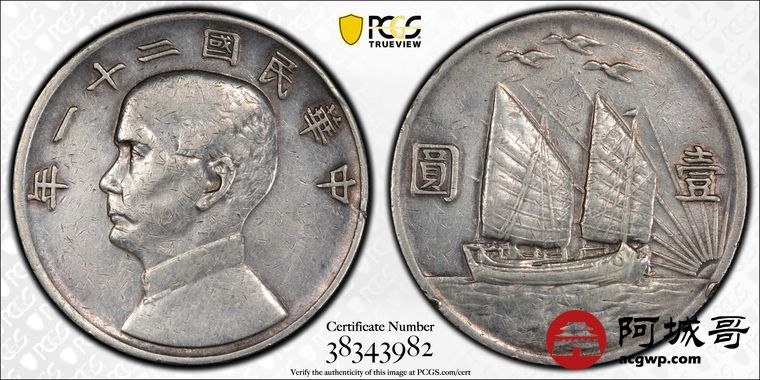 Lot:12 原味 民国21年三鸟 船洋 壹元 PCGS XF