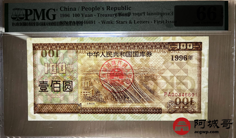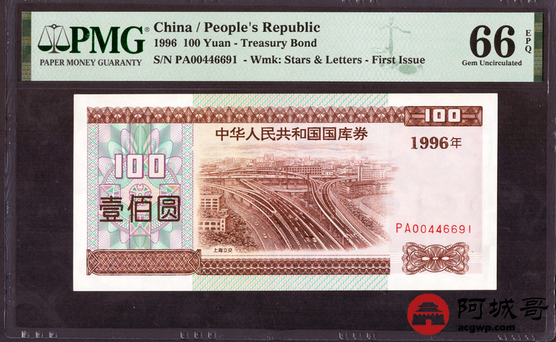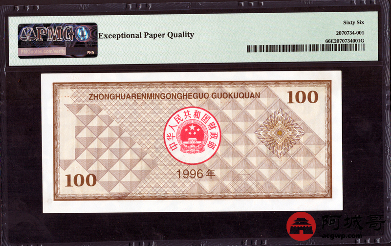 Lot:4 中华人民共和国国库券 1996年 100元 PMG 66EPQ