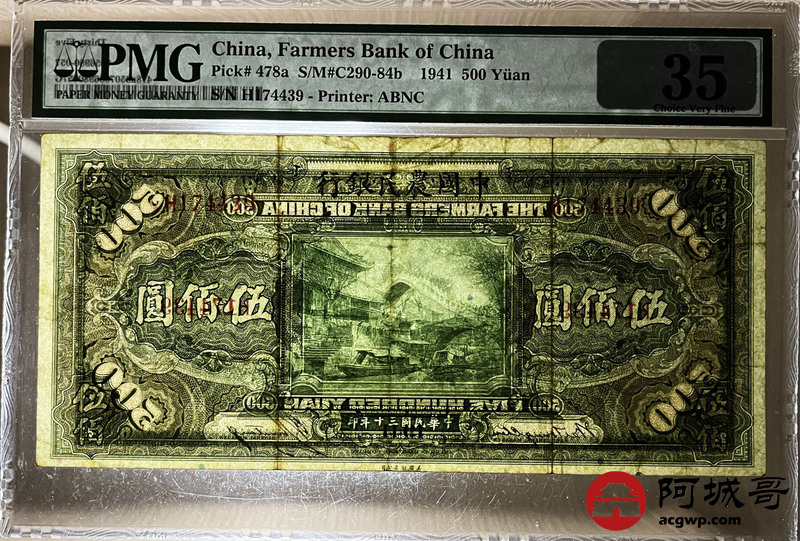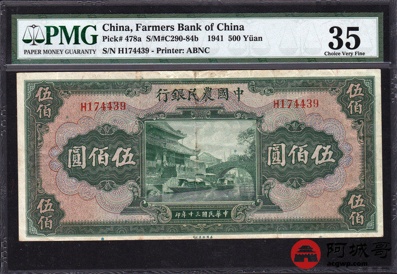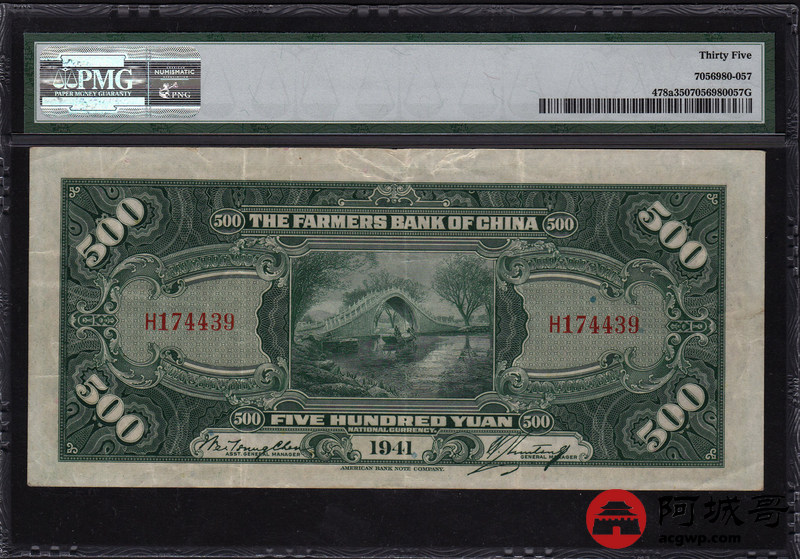 Lot:28 中华民国三十年 伍佰圆 单字轨 中国农民银行 PMG 35