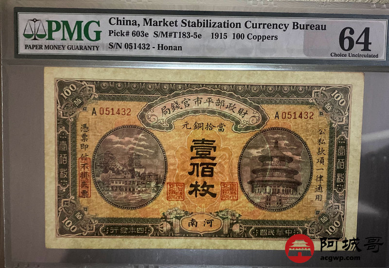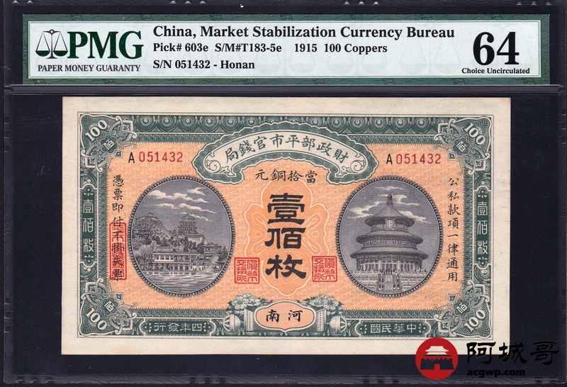 Lot:21 民国四年 壹佰枚 财政部平市官钱局 PMG 64 乱龙号 河南地名少见