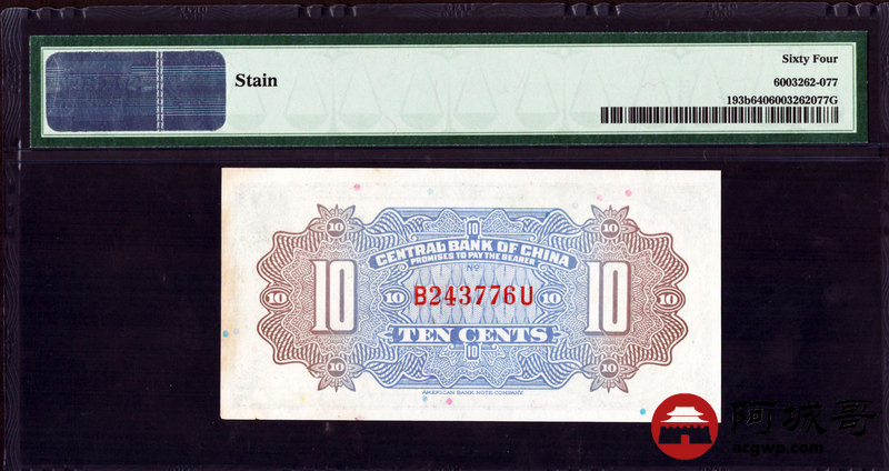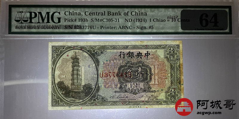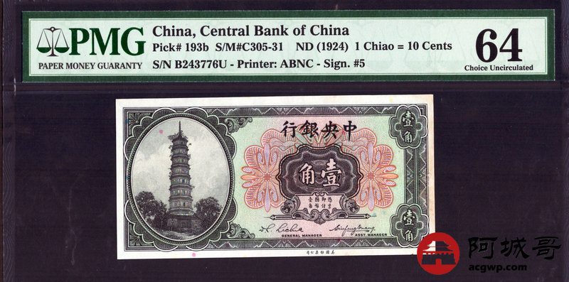 Lot:22 1924年 中央银行 壹角 PMG 64