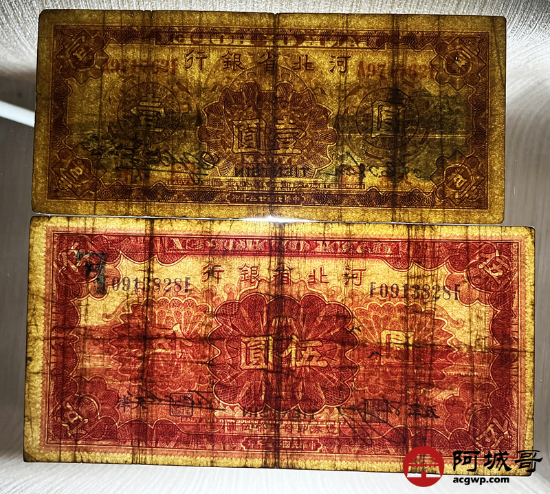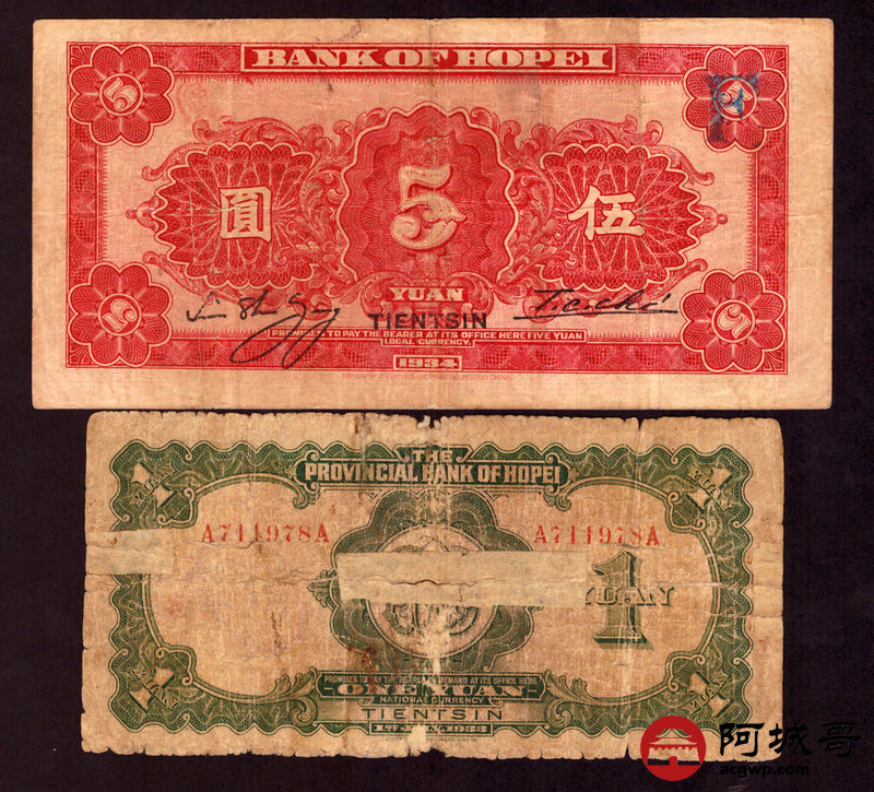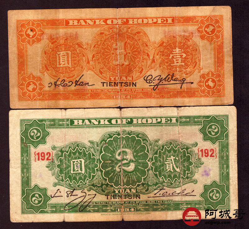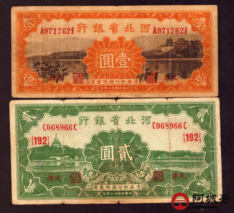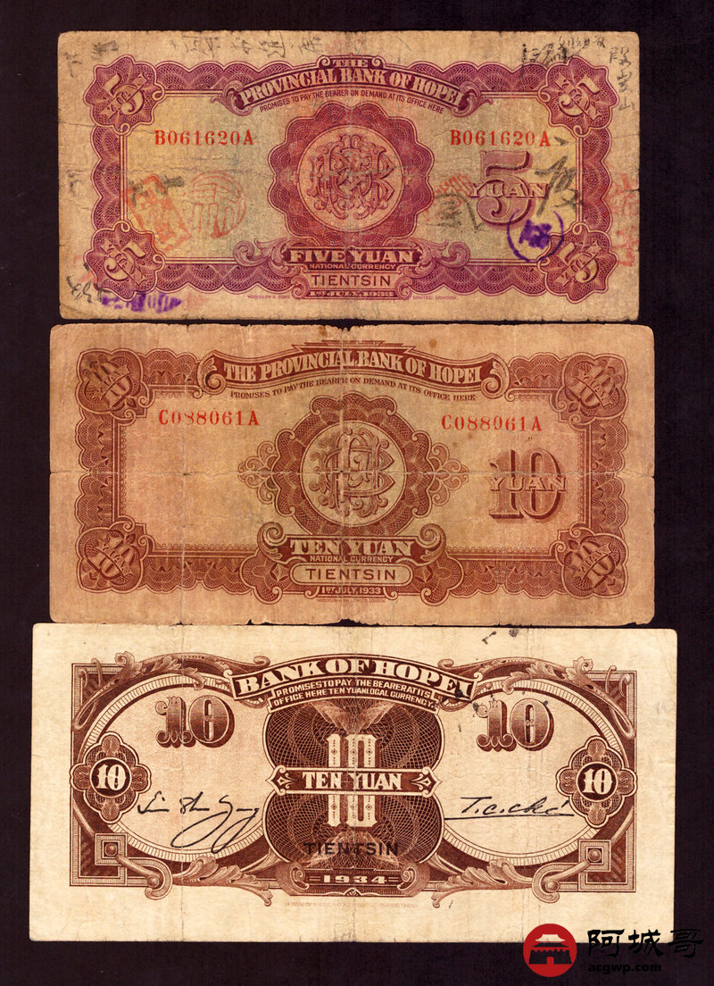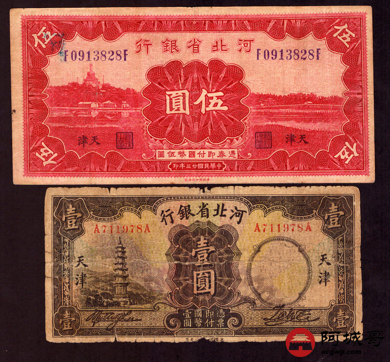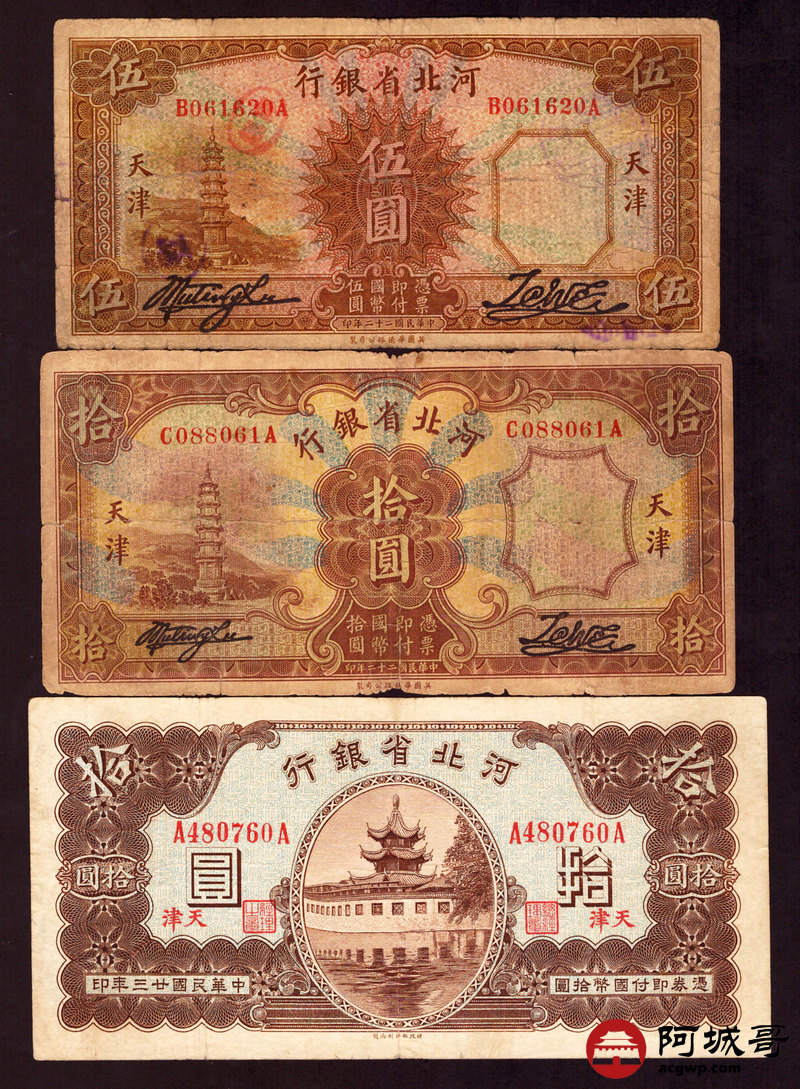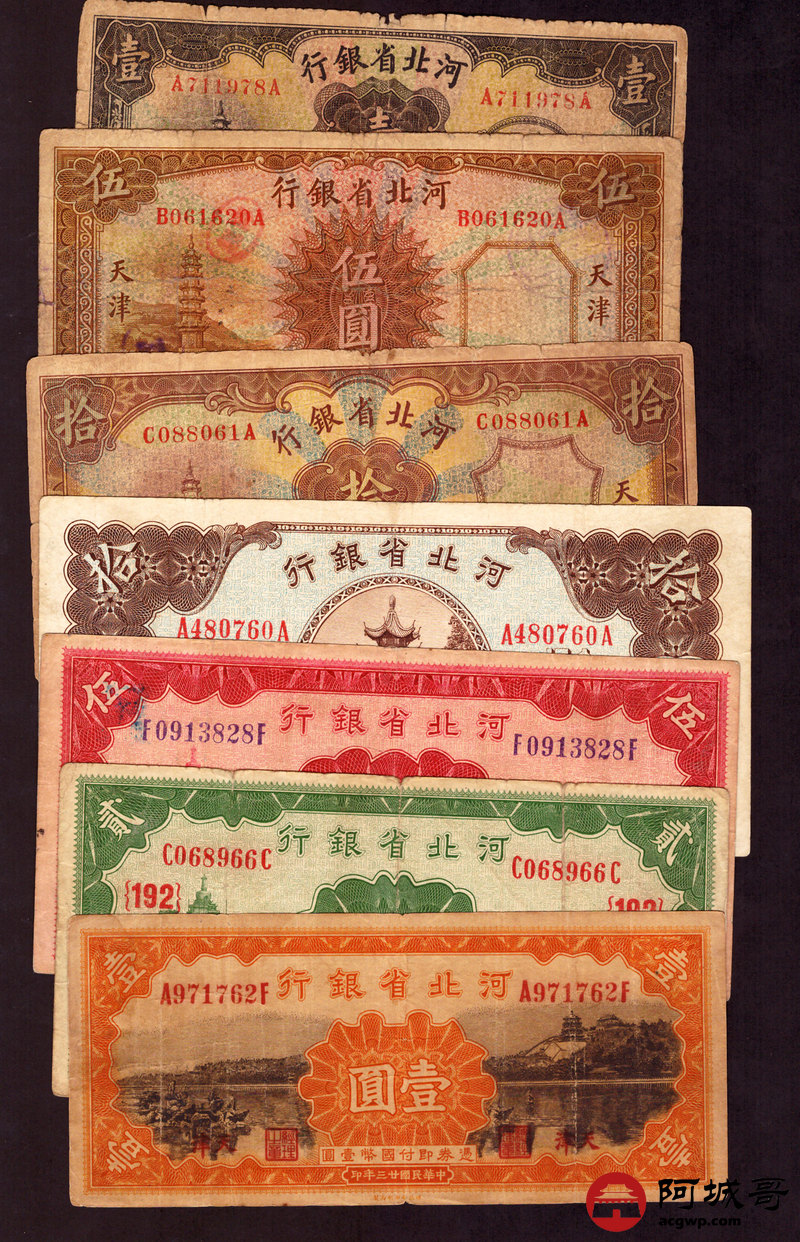 Lot:23 河北省银行一套7张 天津地名 65至85成新 部分非常少见