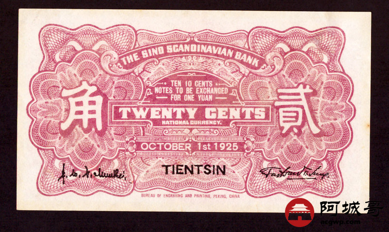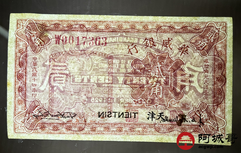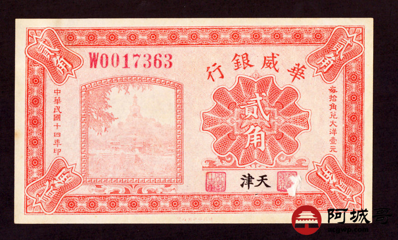 Lot:26 民国14年 贰角 華威银行 地名天津 89成新