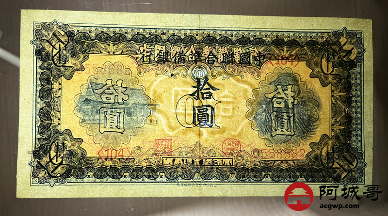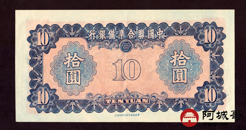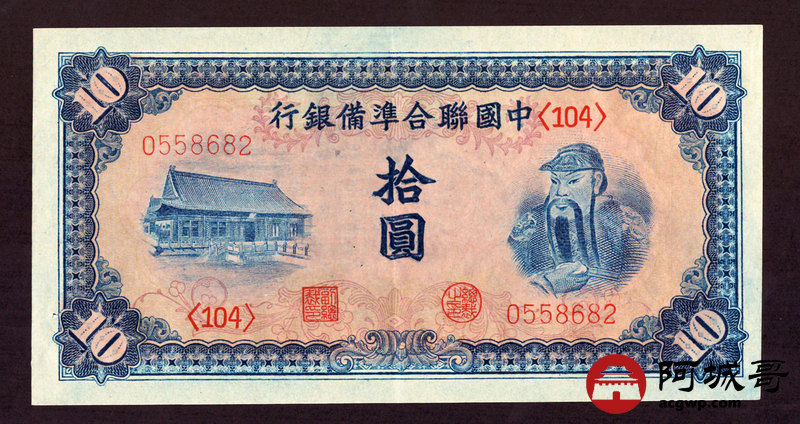 Lot:2 中国联合准备银行 拾圆右岳飞像 有1小孔 89成新