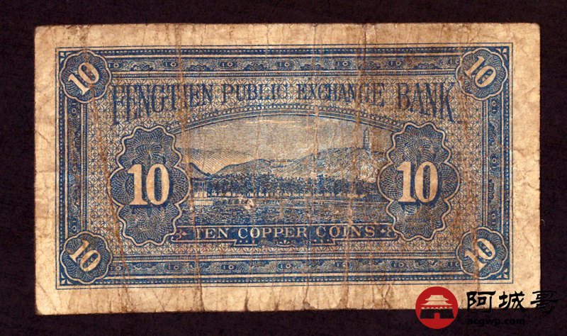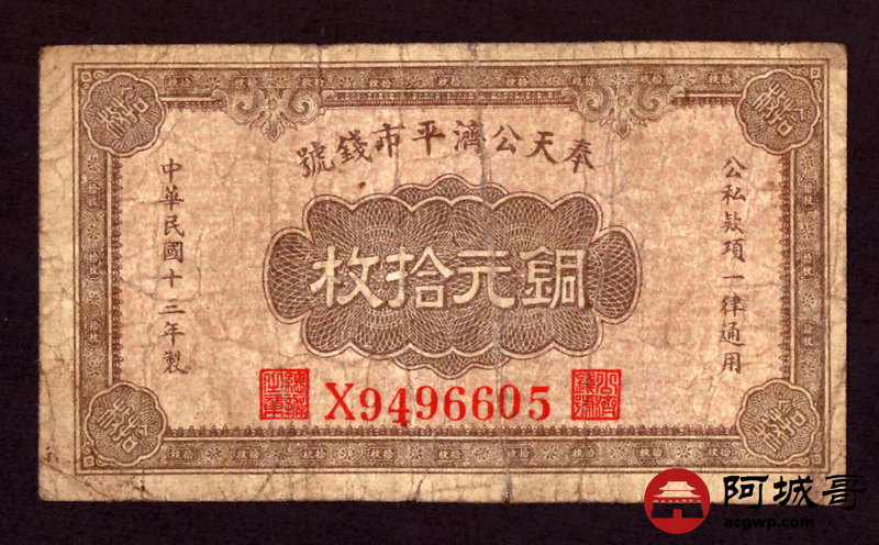 Lot:11 民国13年 奉天公济平市钱号 铜元拾枚 76成新