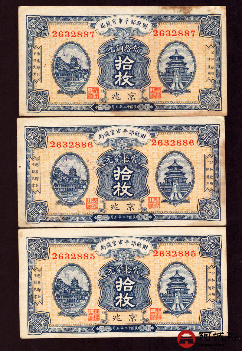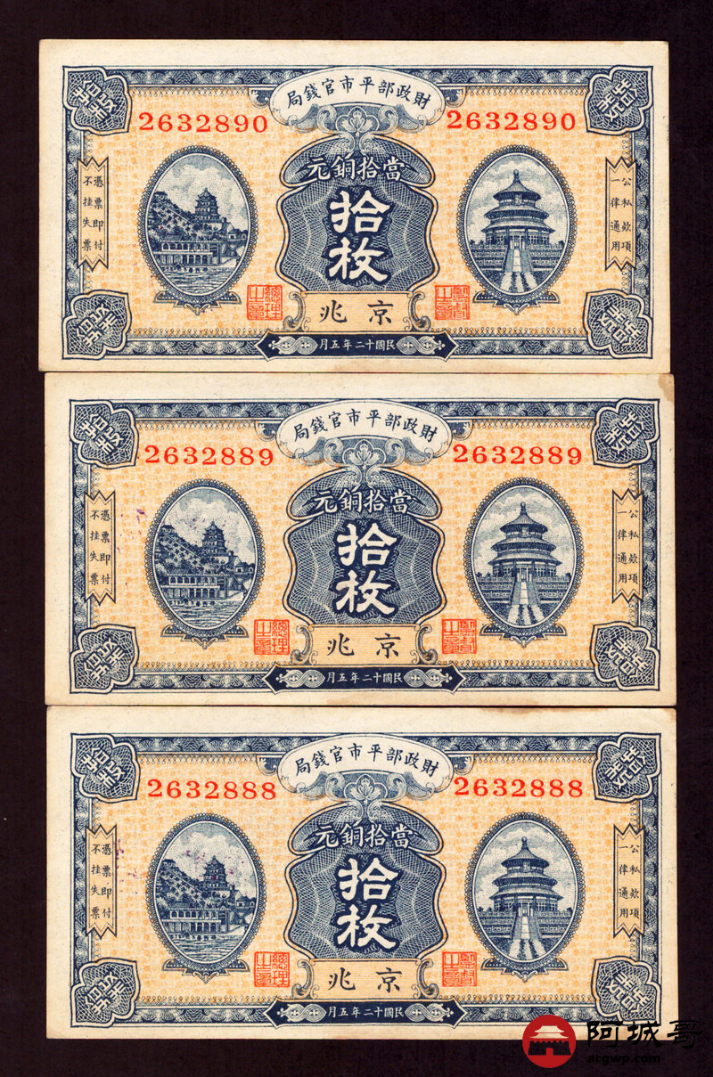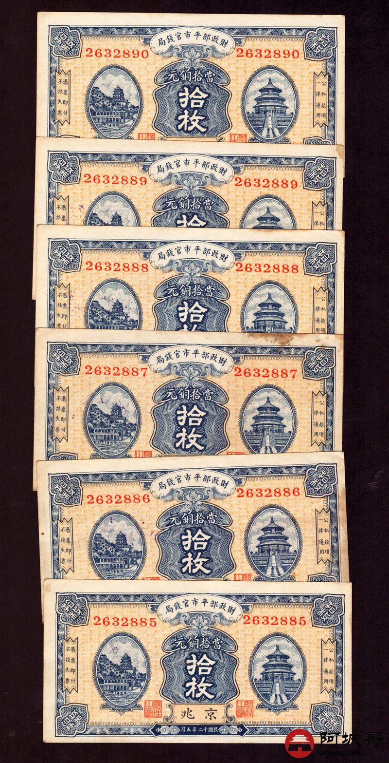 Lot:38 民国12年 财政部平市官钱局 拾枚 连号6张 内有豹子号888 88至9成新