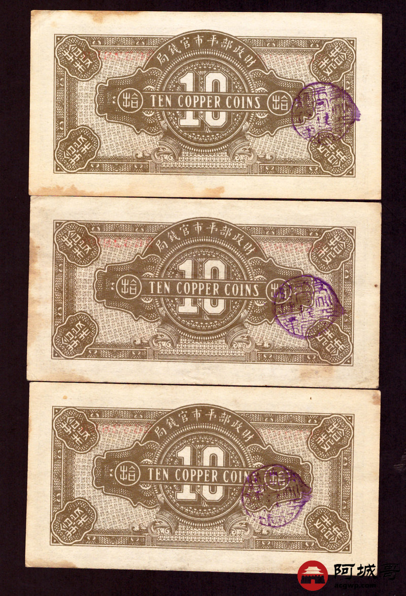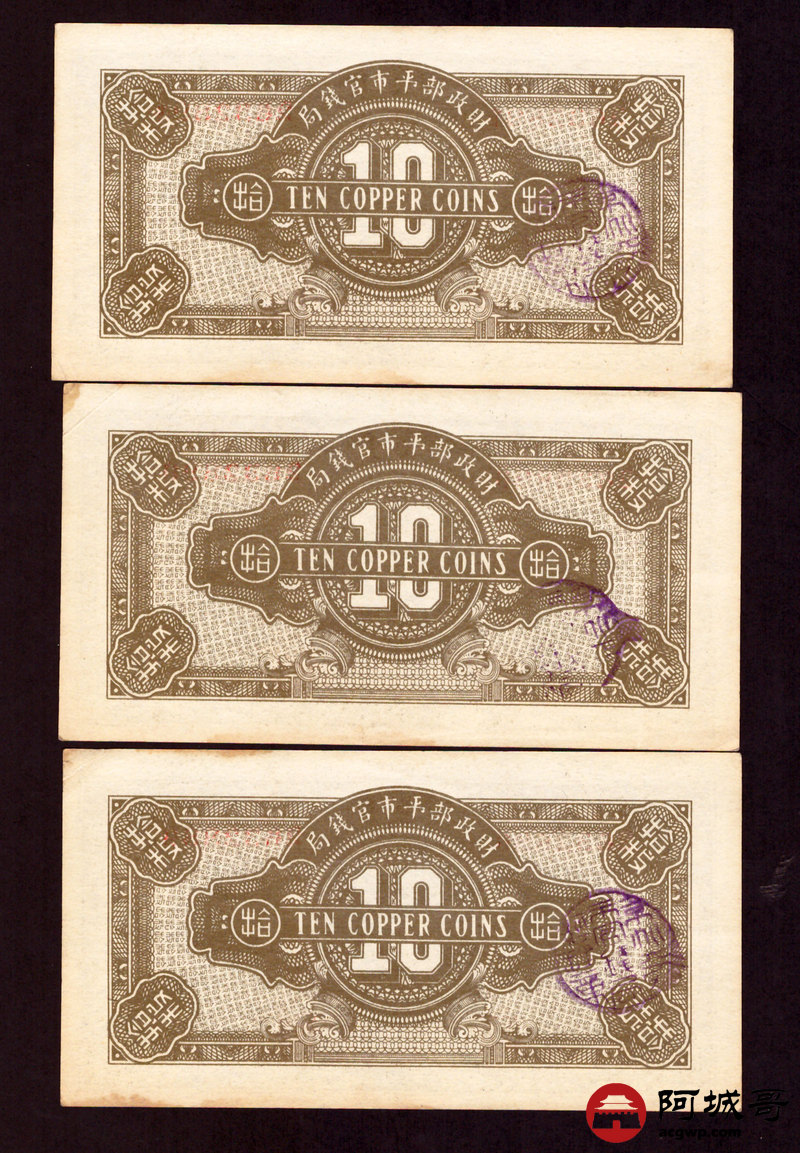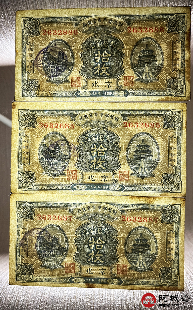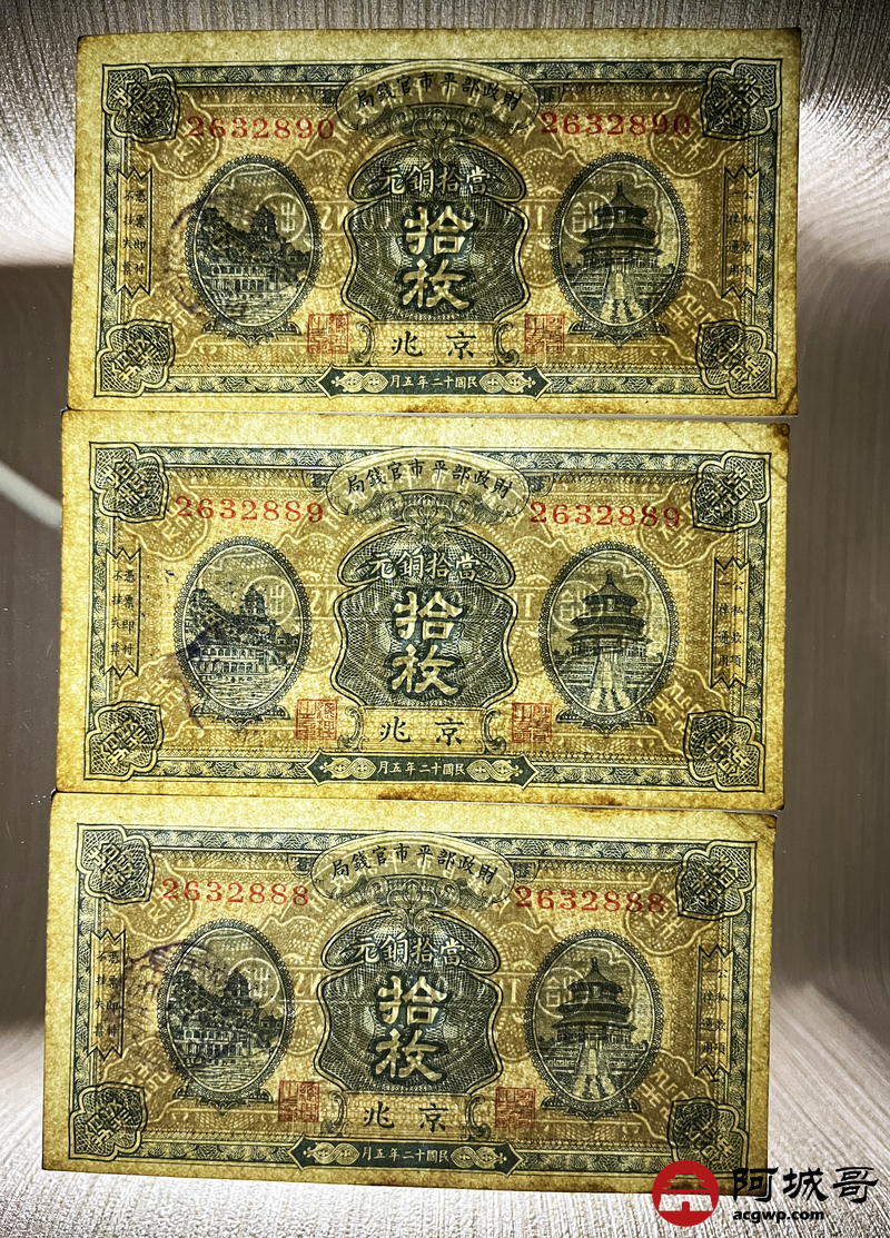 Lot:38 民国12年 财政部平市官钱局 拾枚 连号6张 内有豹子号888 88至9成新