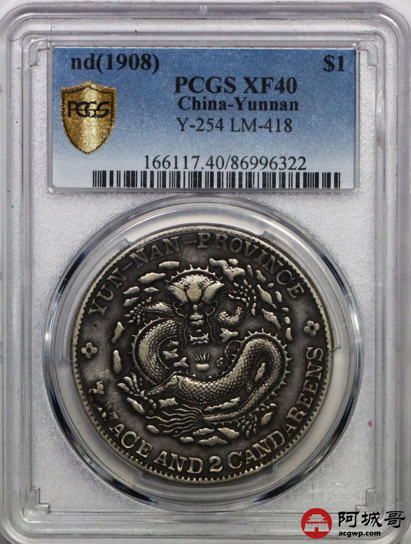 Lot:13 原味 包浆 老云南光绪 龙洋 7.2 PCGS XF 40