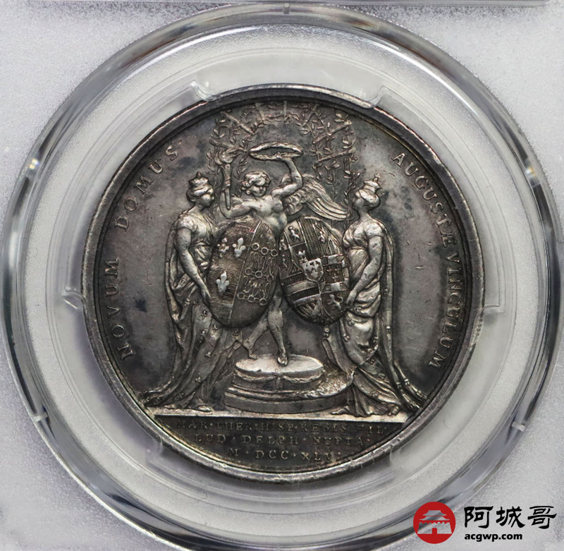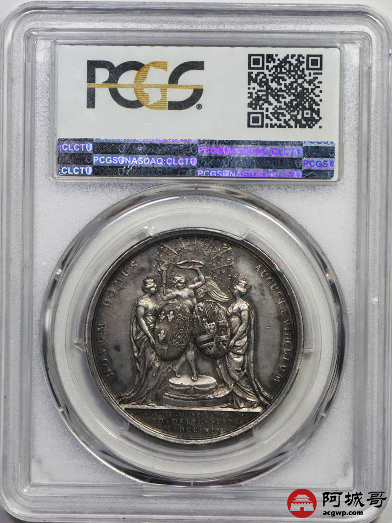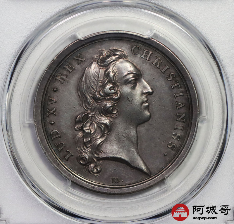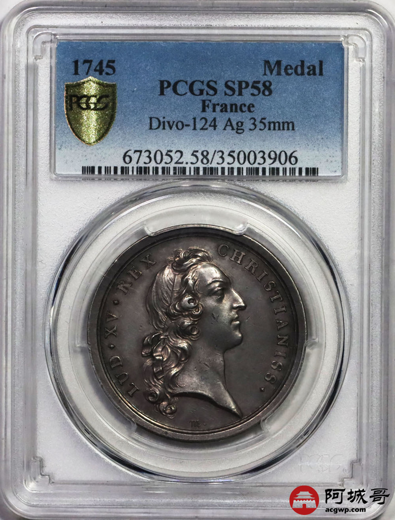 Lot:11 酱彩黑包浆高浮雕人像立体未流通 1745年法国路易十六银质样章 P盒最高分 唯一入盒 PCGS SP58